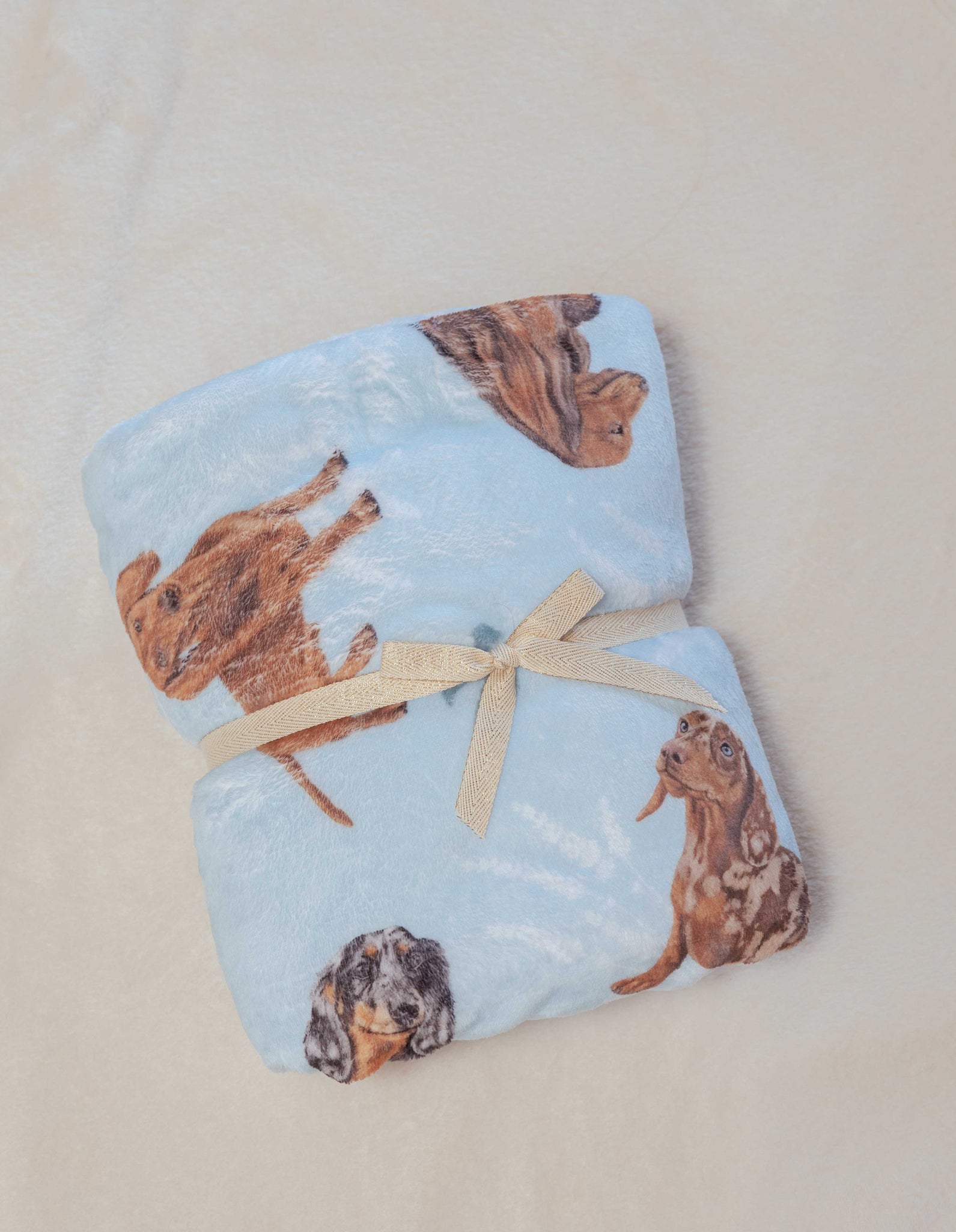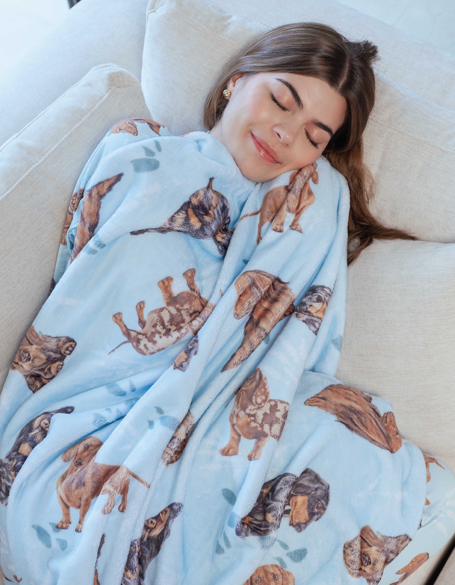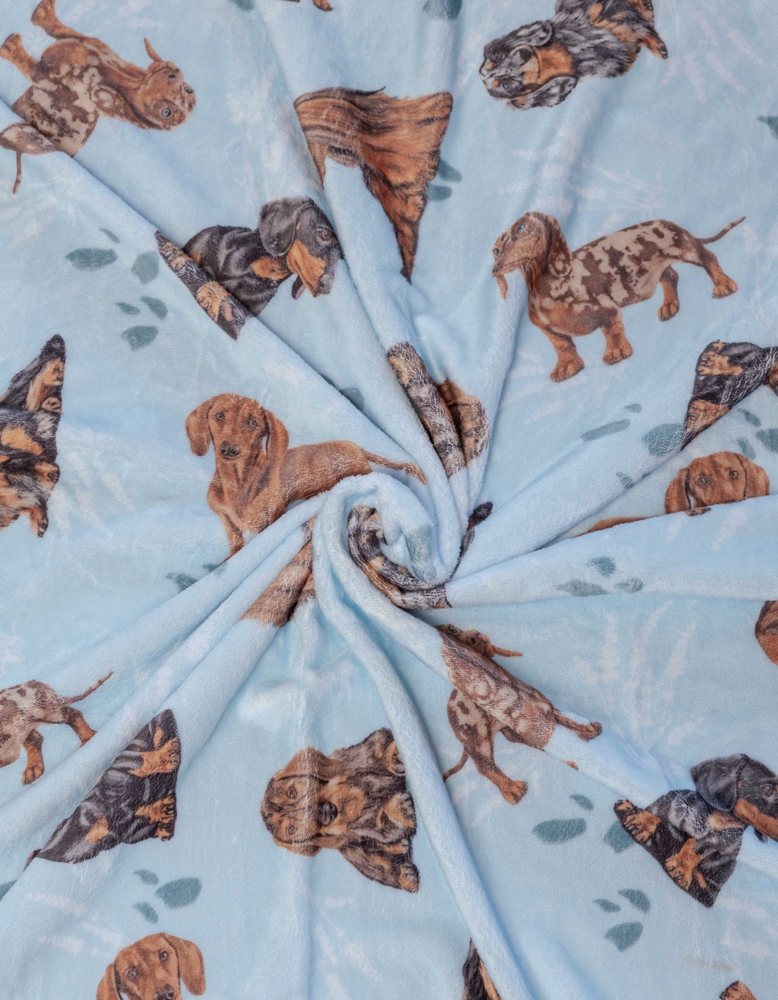Esta cobija está ilustrada a mano con diferentes perros: Salchicha.