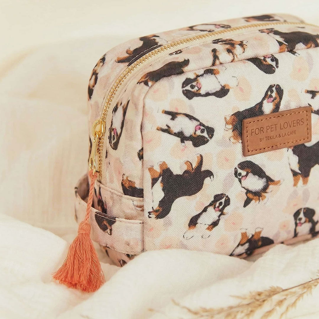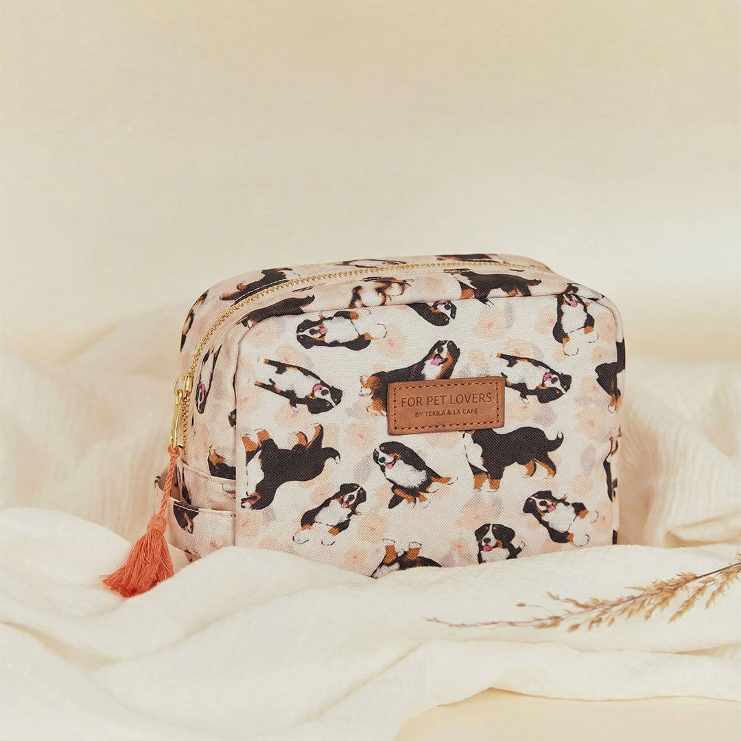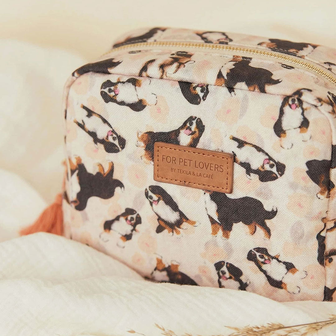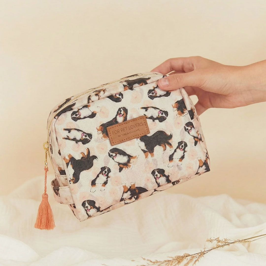 Cosmetiquera estampada, con forro interno en tela antifluídos, cremallera dorada y borla decorativa. Detalle contramarcado en cuero 100%. Este producto está ilustrado a mano con diferentes razas de Bernés de la Montaña. ¡Busca tu peludito!
