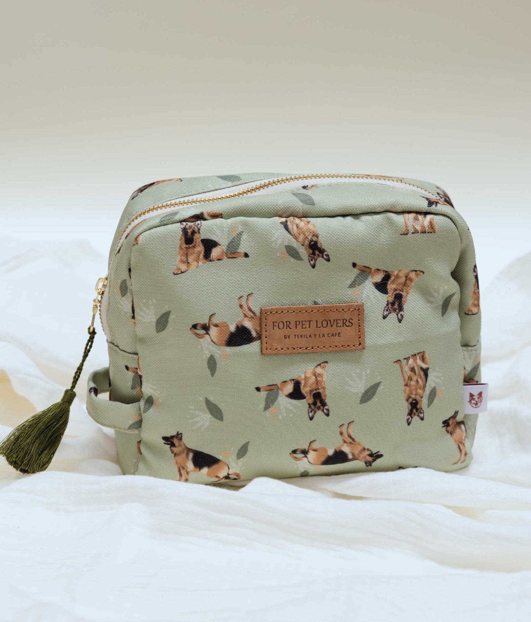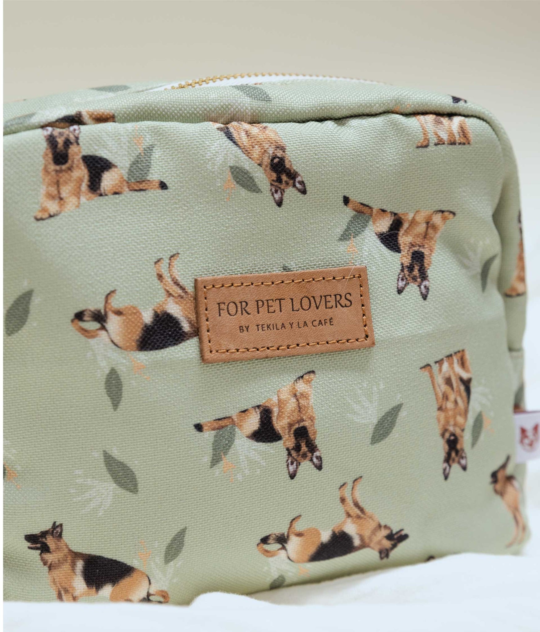 Cosmetiquera estampada, con forro interno en tela antifluídos, cremallera dorada y borla decorativa. Detalle contramarcado en cuero 100%. Este producto está ilustrado a mano con razas de perros: Pastor Alemán ¡Busca tu peludito!