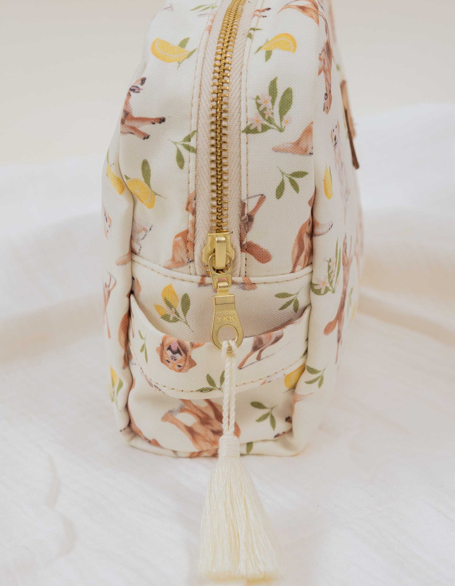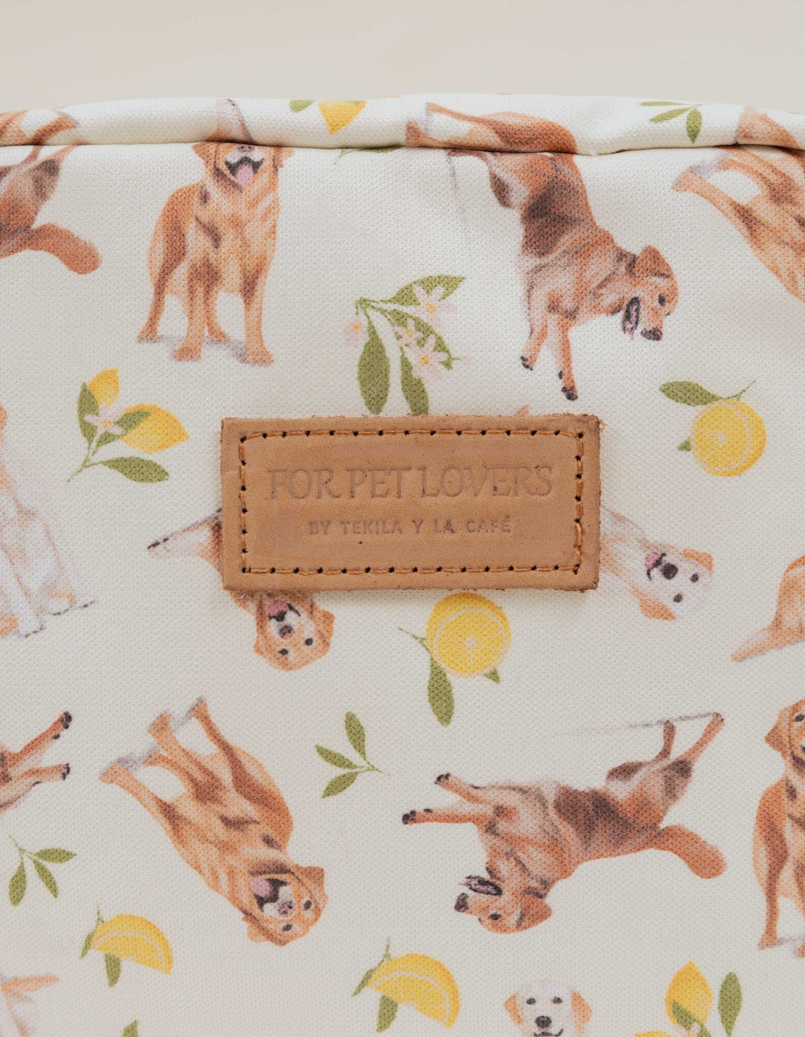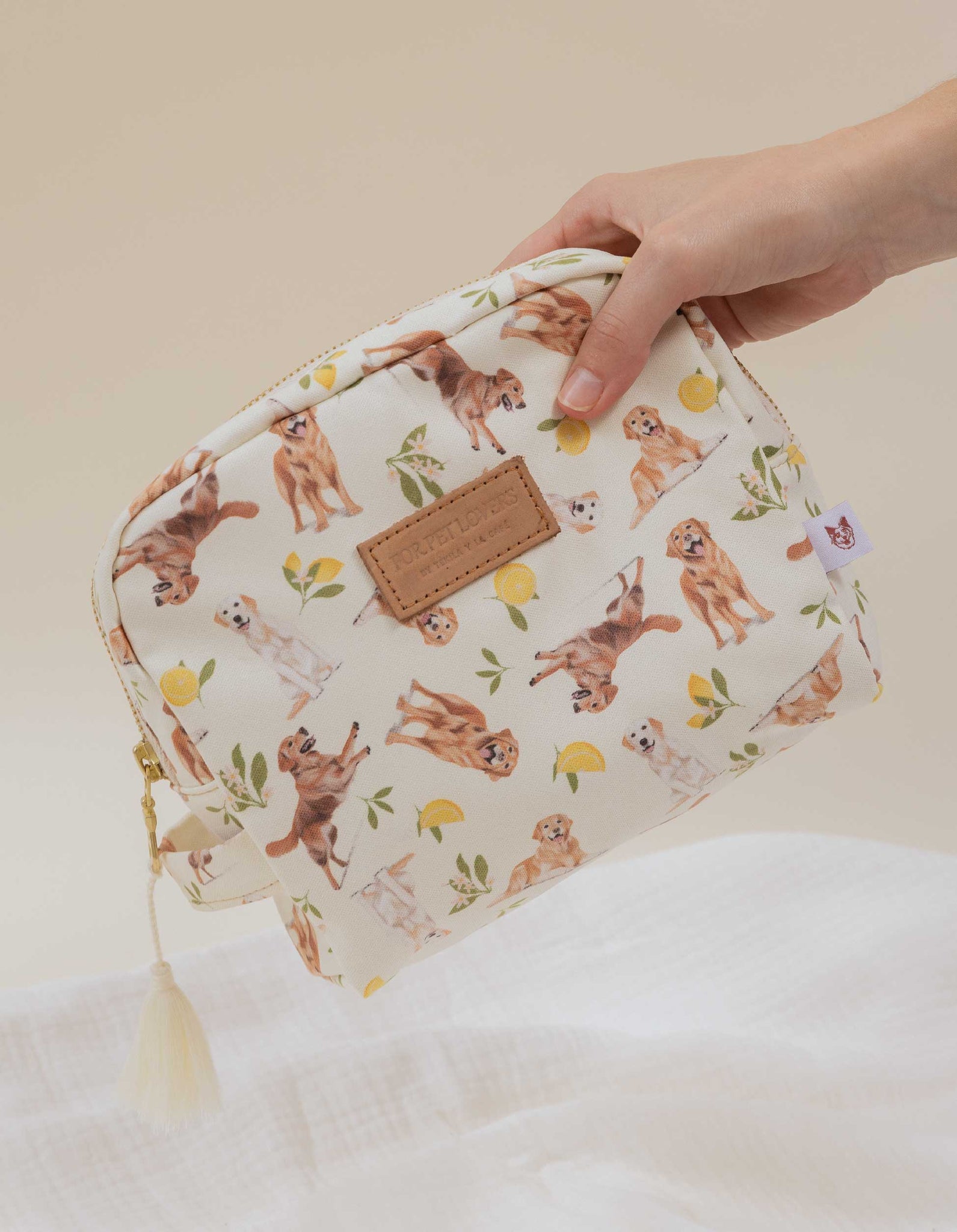 Cosmetiquera estampada, con forro interno en tela antifluídos, cremallera dorada y borla decorativa. Detalle contramarcado en cuero 100%. Este producto está ilustrado a mano con diferentes razas de perros: Golden Retriever. ¡Busca tu peludito!