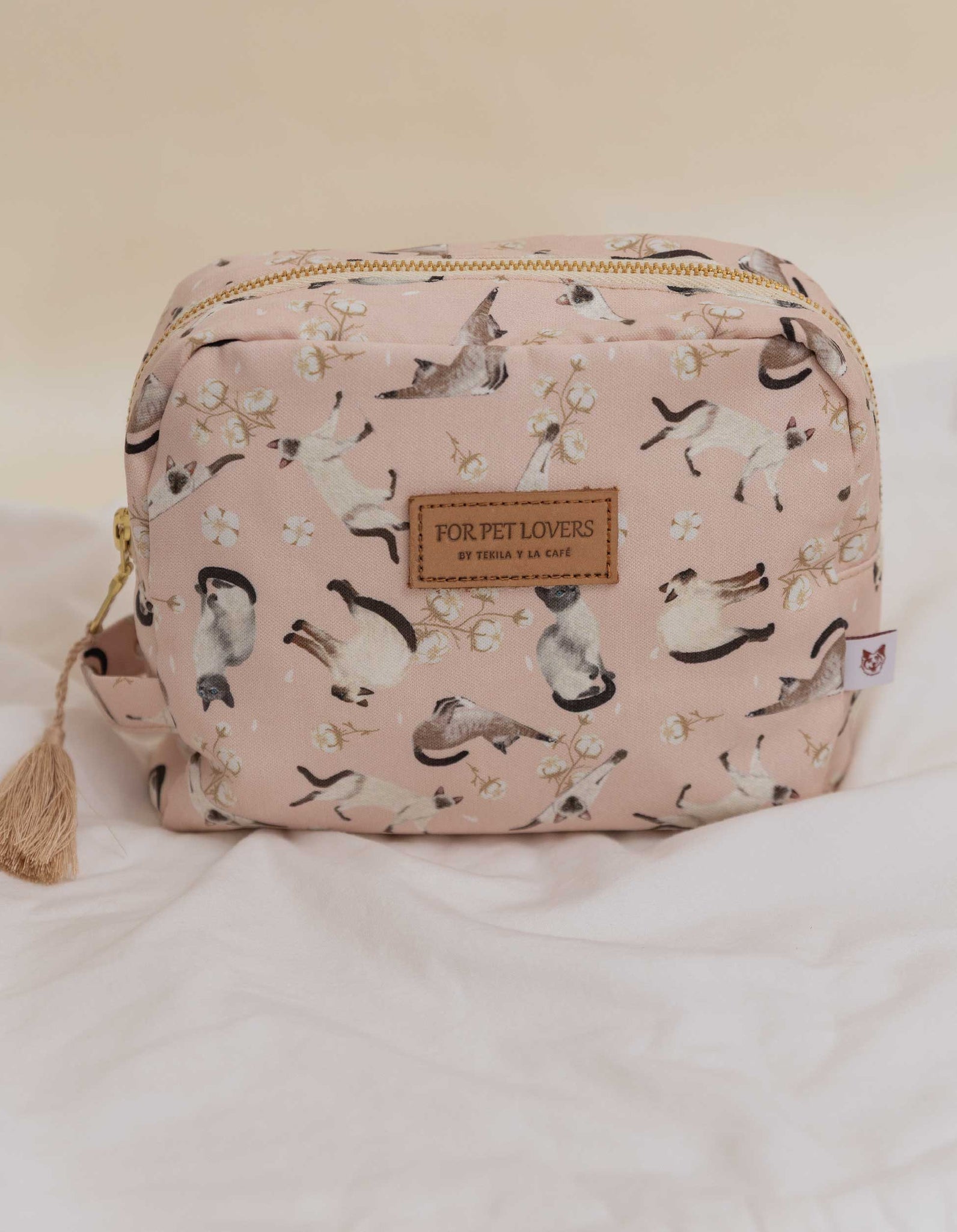 Cosmetiquera estampada, con forro interno en tela antifluídos, cremallera dorada y borla decorativa. Detalle contramarcado en cuero 100%. Este producto está ilustrado a mano con diferentes gatos siamés.