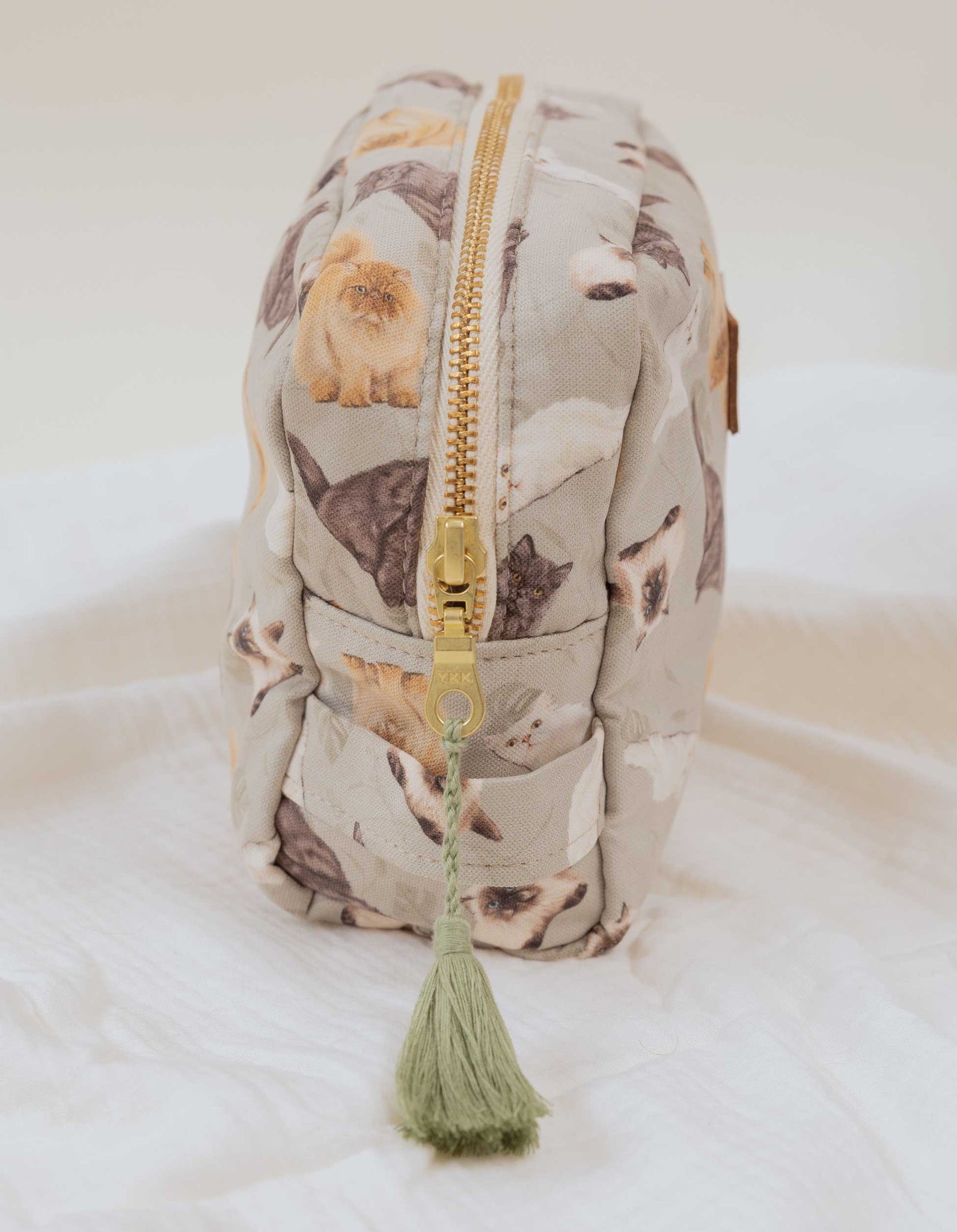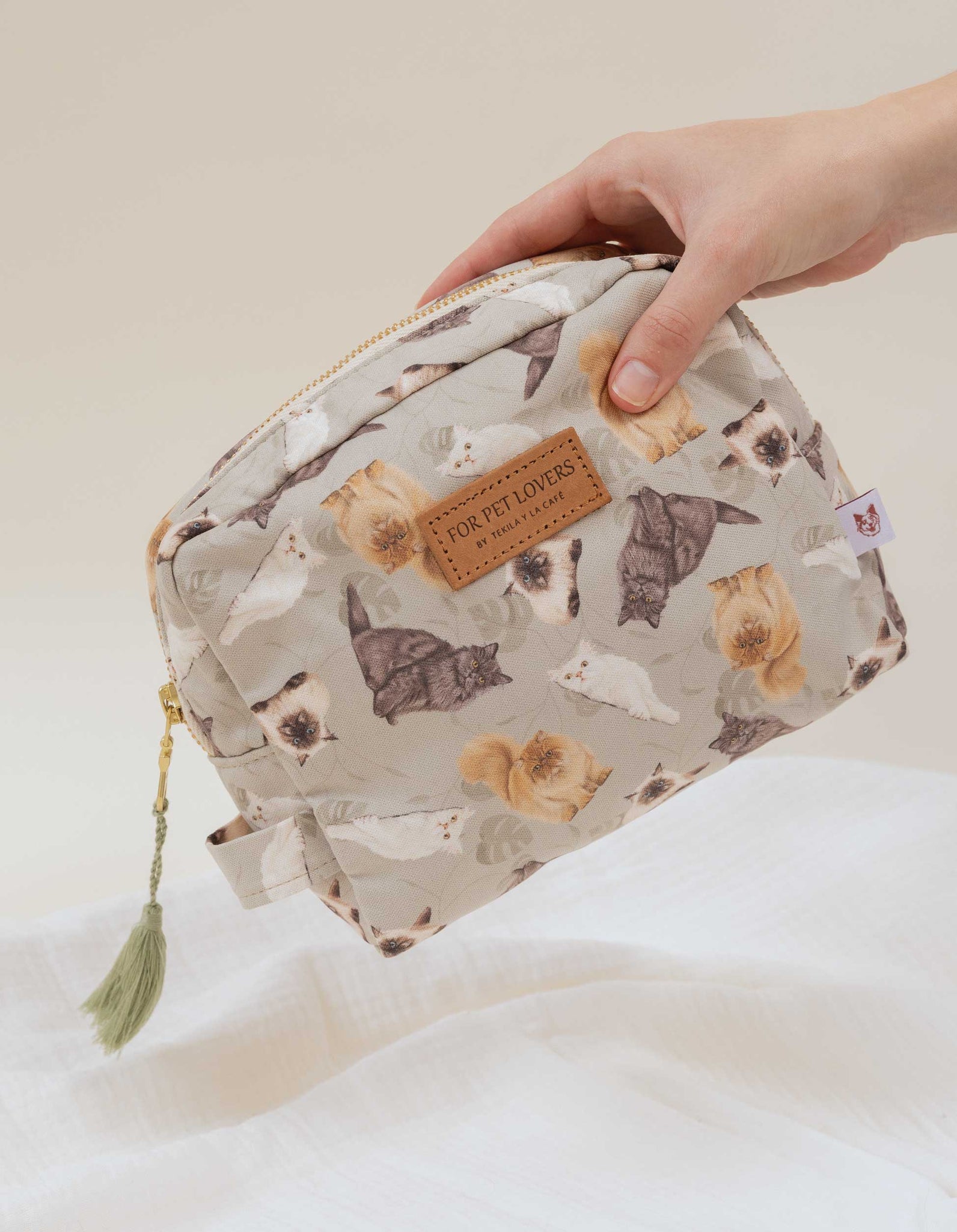 Cosmetiquera estampada, con forro interno en tela antifluídos, cremallera dorada y borla decorativa. Detalle contramarcado en cuero 100%. Este producto está ilustrado a mano con gatos de raza Persa