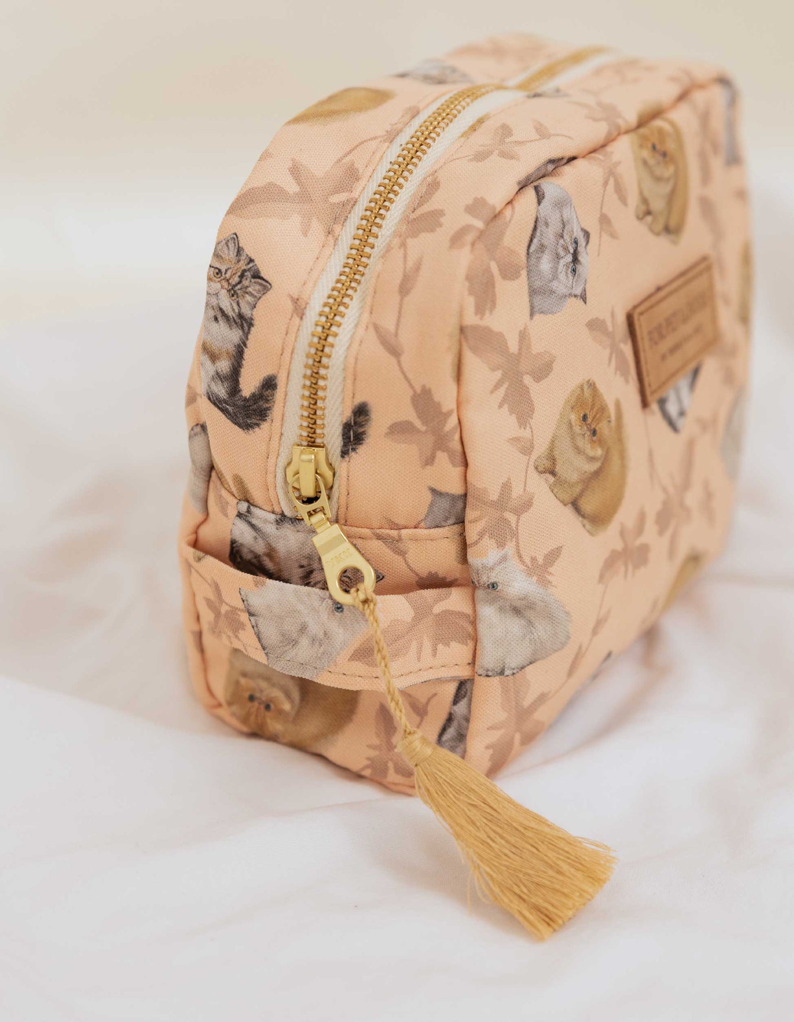 Cosmetiquera estampada, con forro interno en tela antifluídos, cremallera dorada y borla decorativa. Detalle contramarcado en cuero 100%. Este producto está ilustrado a mano con diferentes gatos Persa.