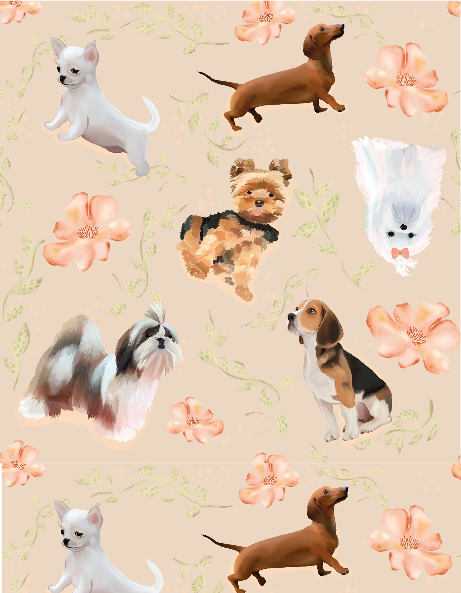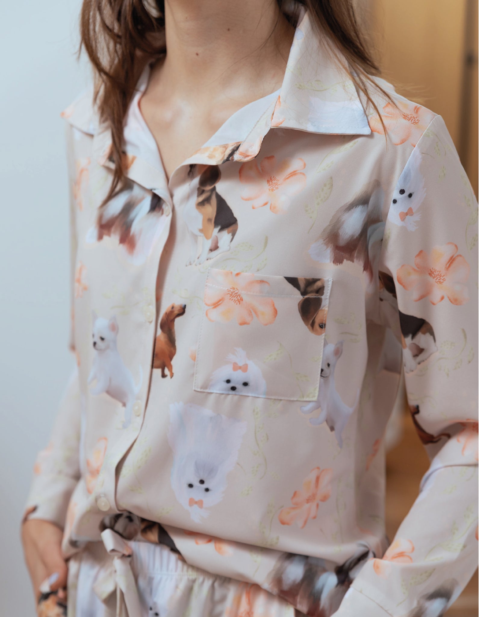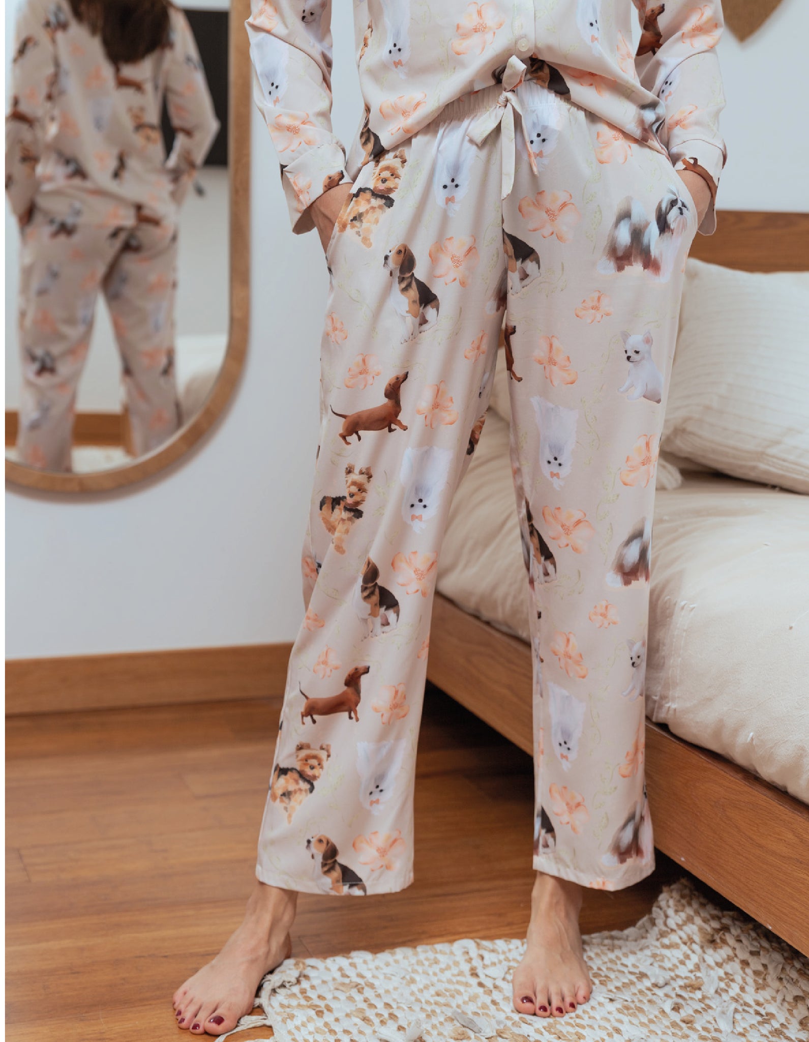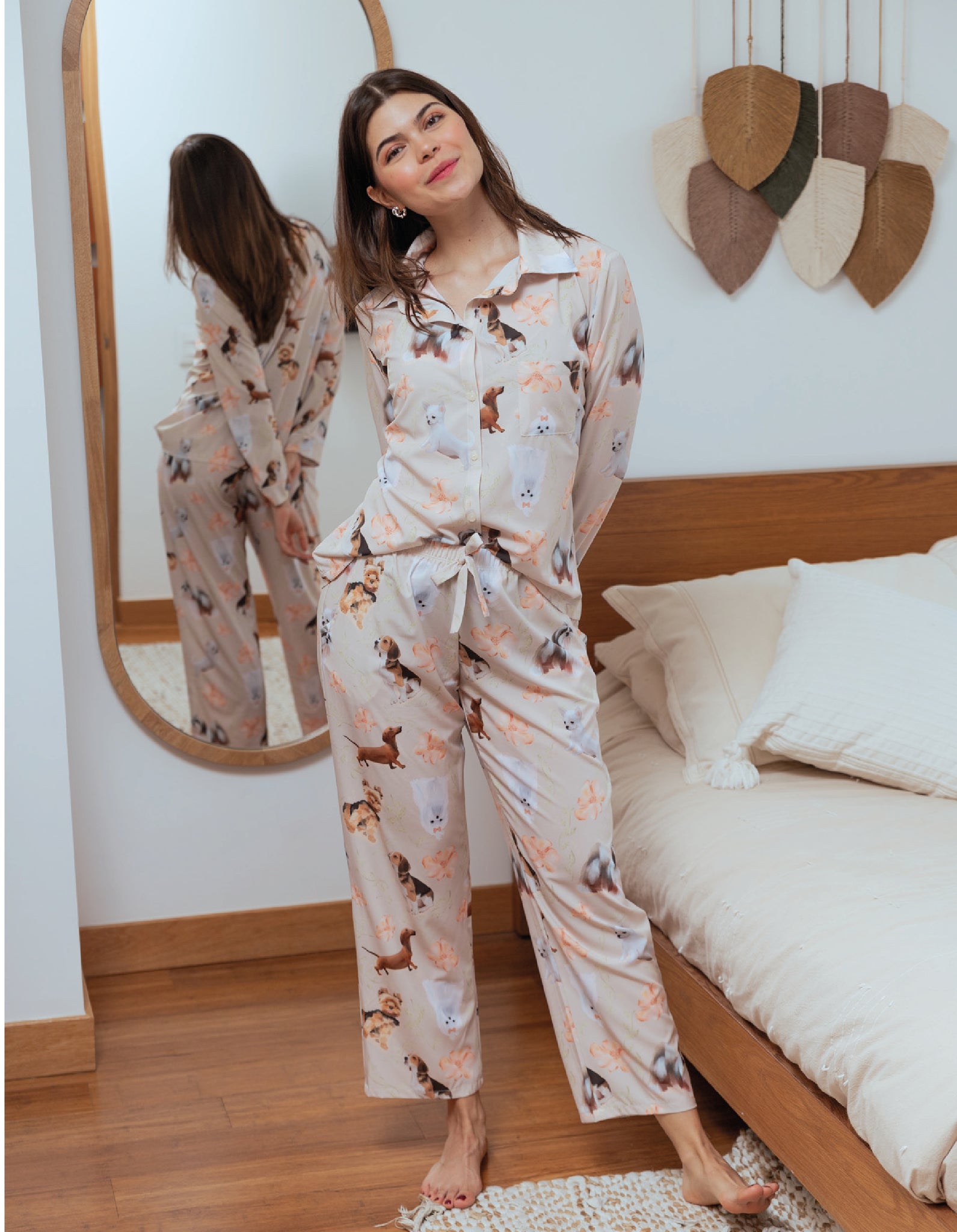 Pijama para mujer con pantalón y camisa manga larga de abotonadura, estampada con ilustraciones realizadas a mano de perros razas pequeñas como: Yorkie, Shih- Tzu, Beagle, Salchicha y Chihuahua. Es una pijama de tacto frío tipo satín opaco, Suave, con la piel muy cómoda y elegante.