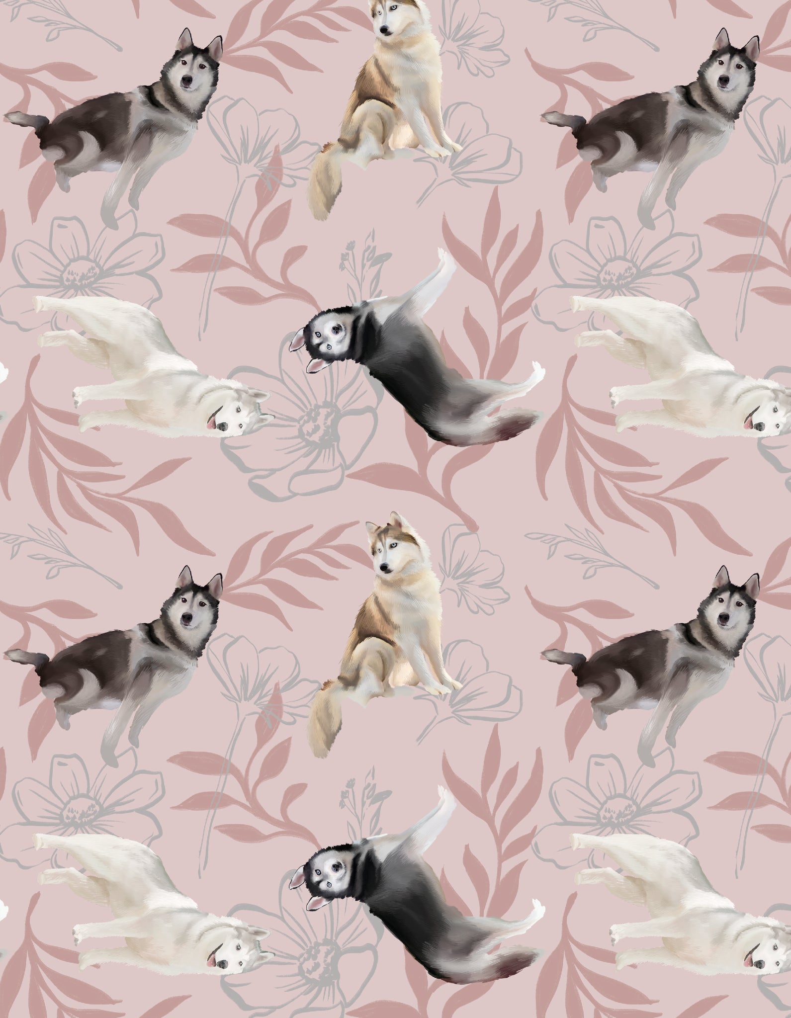 Pijama para mujer con pantalón y camisa manga larga de abotonadura, estampada con ilustraciones realizadas a mano de Husky. Es una pijama de tacto frío tipo satín opaco. Suave, con la piel muy cómoda y elegante.