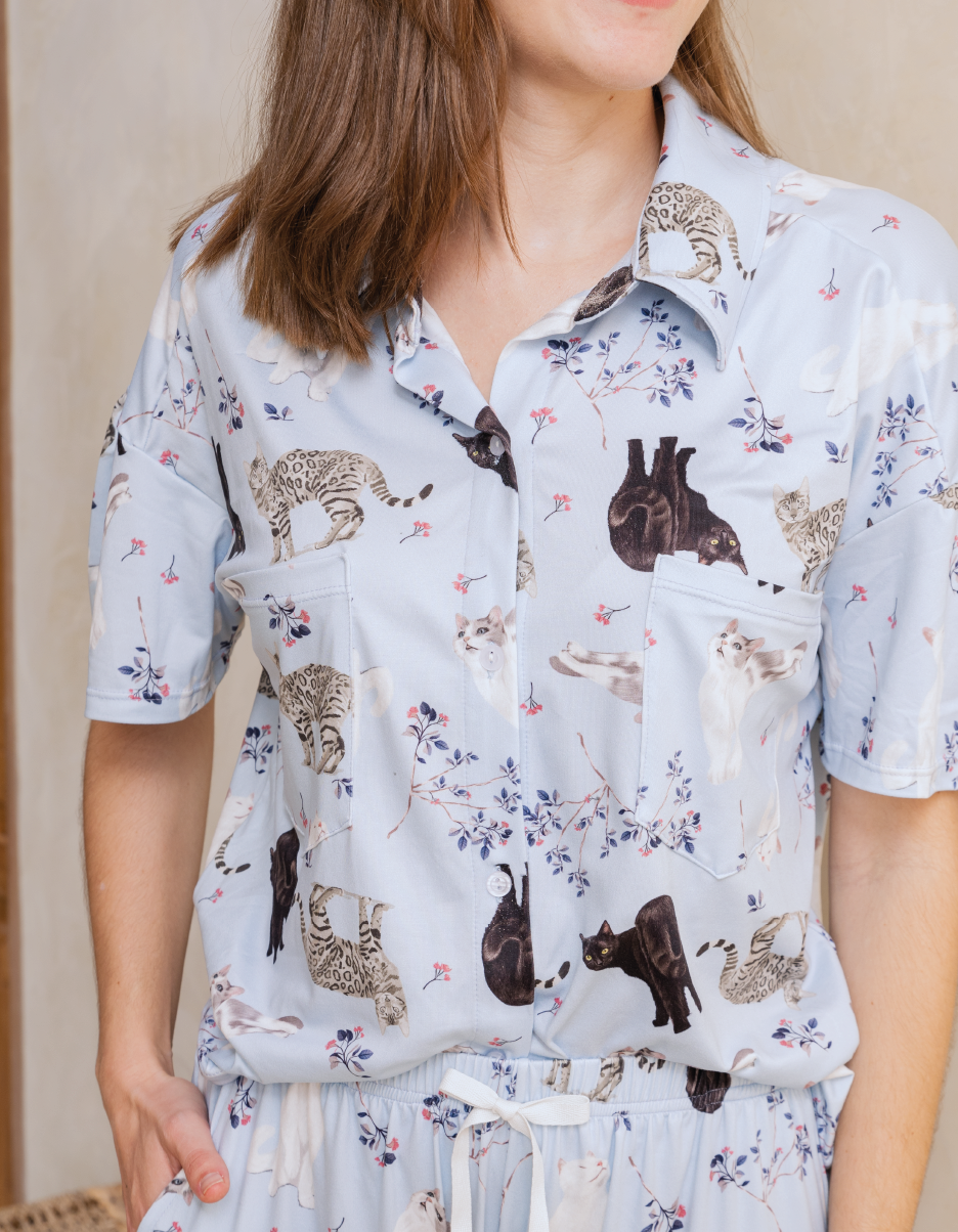 Pijama para mujer de pantalón largo y camisa de abotonadura manga corta, ambas prendas ilustradas a mano con diferentes razas de gatos.