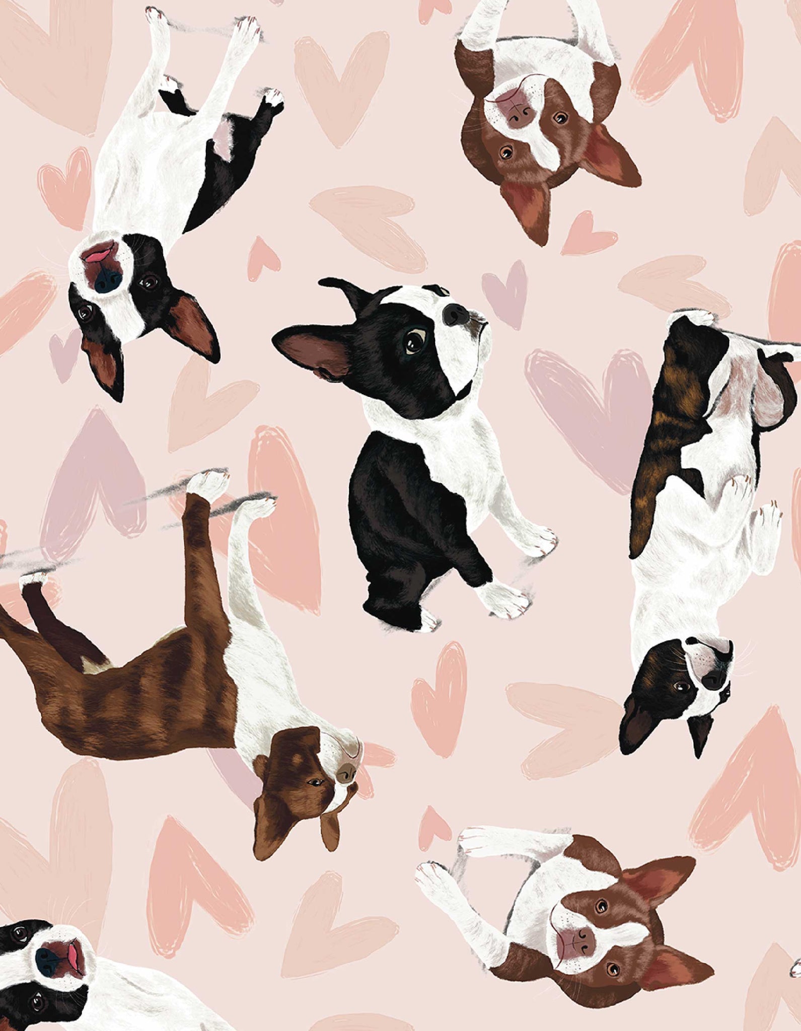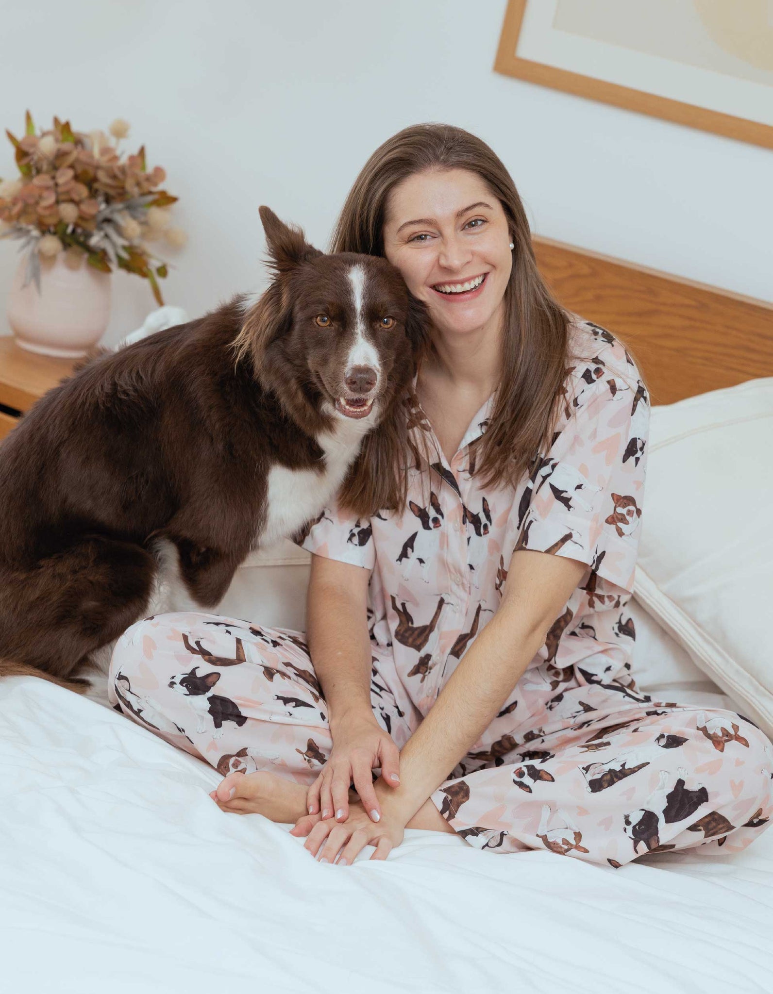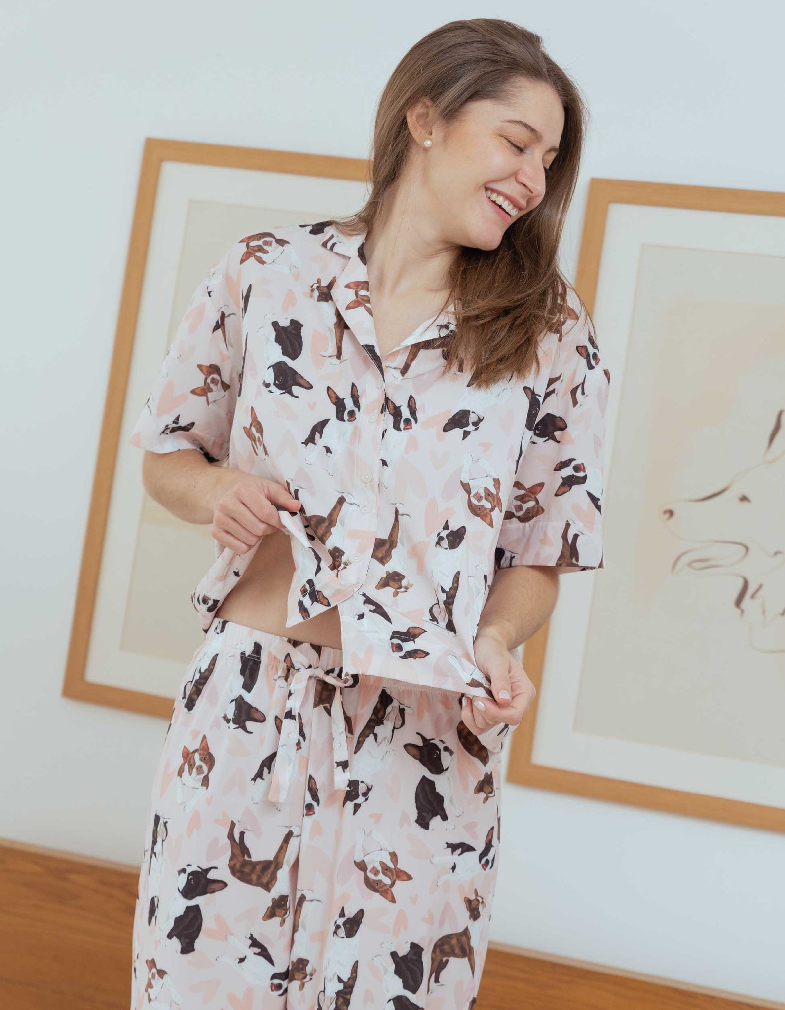 Pijama de pantalón largo y camisa de botones manga corta, con un estampado adorable de ilustraciones de perritos Boston Terrier hechas a mano.