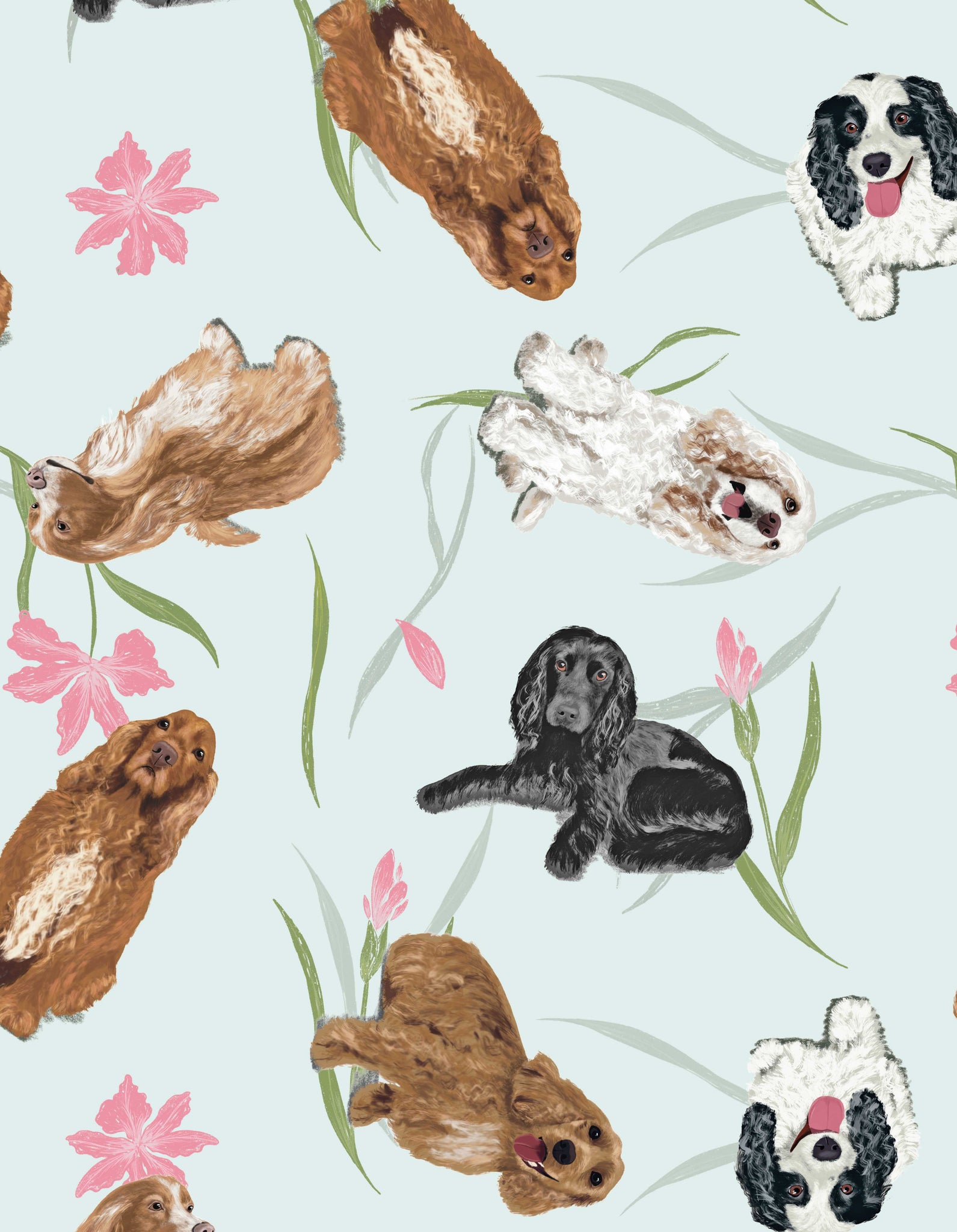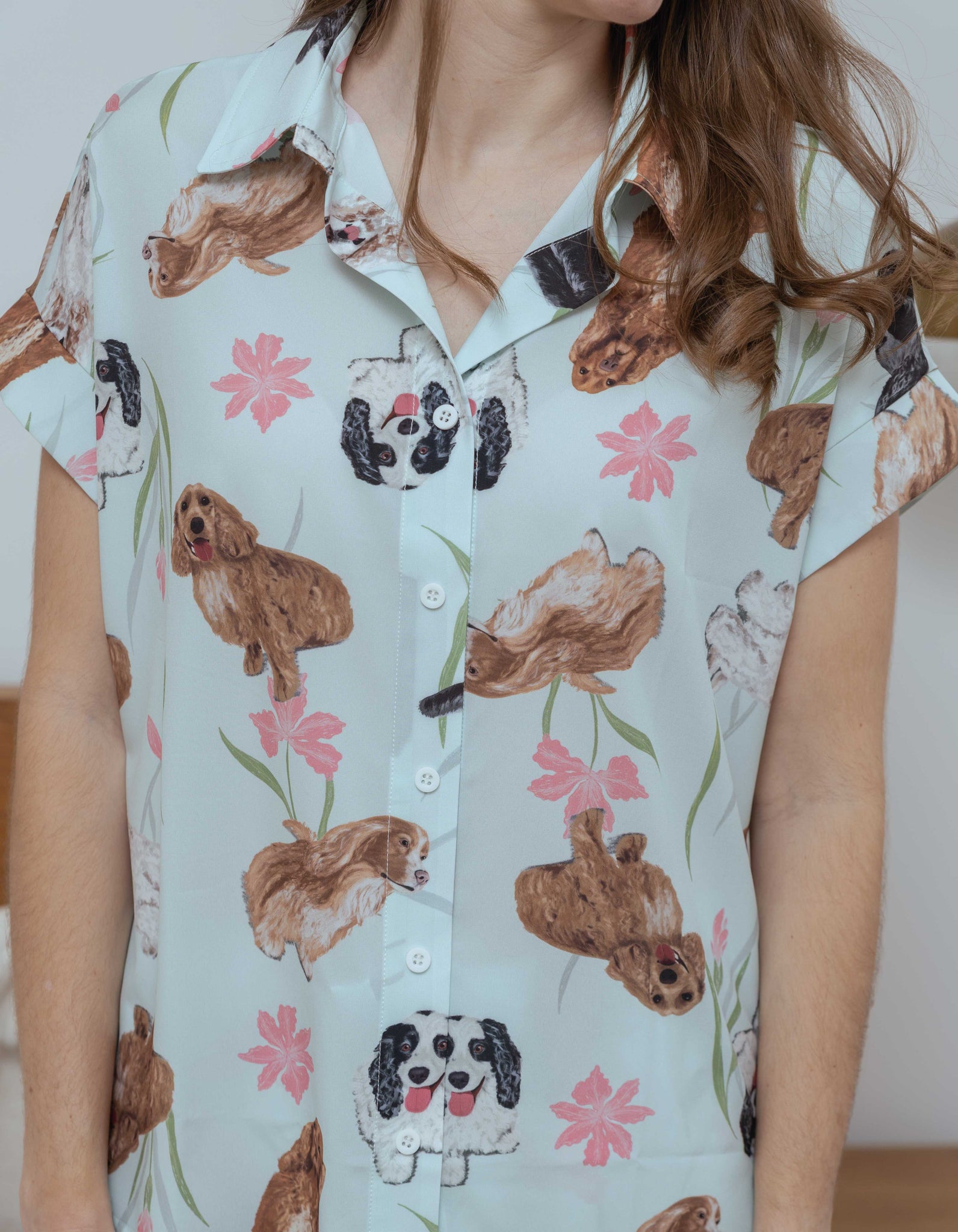 Pijama de pantalón largo y camisa de botones manga corta, con un estampado adorable de ilustraciones hechas a mano de perritos Cocker.
