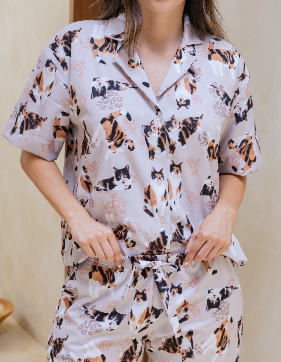 Ambas prendas estampadas con ilustraciones realizadas a mano de gatos Calicó.