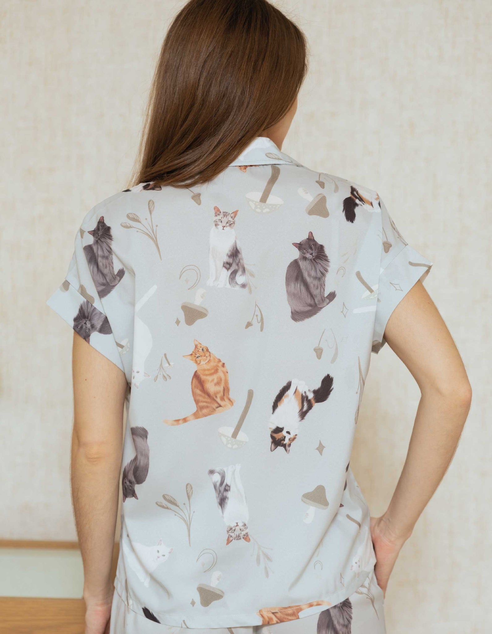 Ambas prendas estampadas con ilustraciones realizadas a mano de gatos criollos.