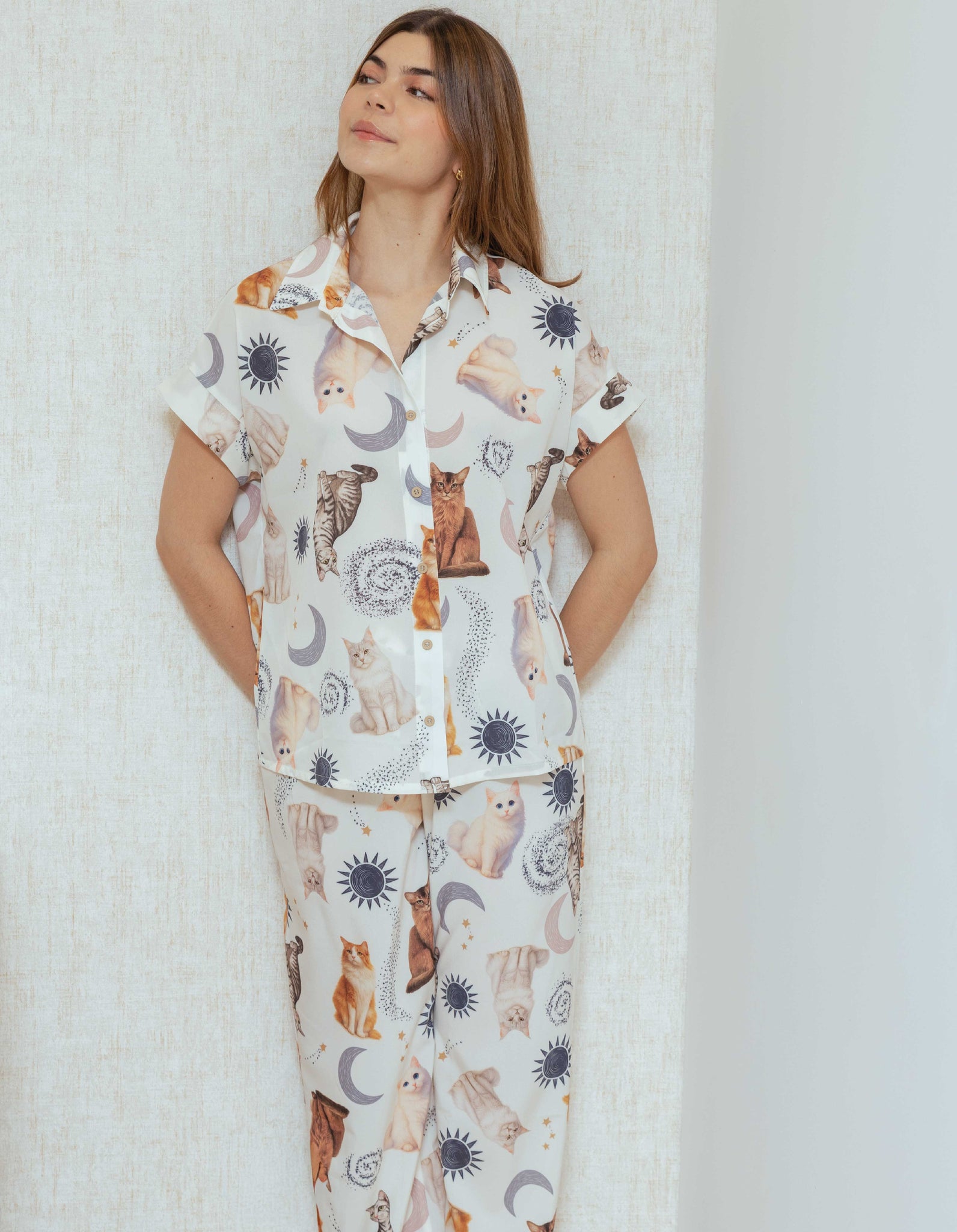 Incluye una camisa de manga corta, de abotonadura frontal y pantalón largo con cinta decorativa en cintura, ambos estampados con adorables ilustraciones hechas a mano de diferentes gatos.