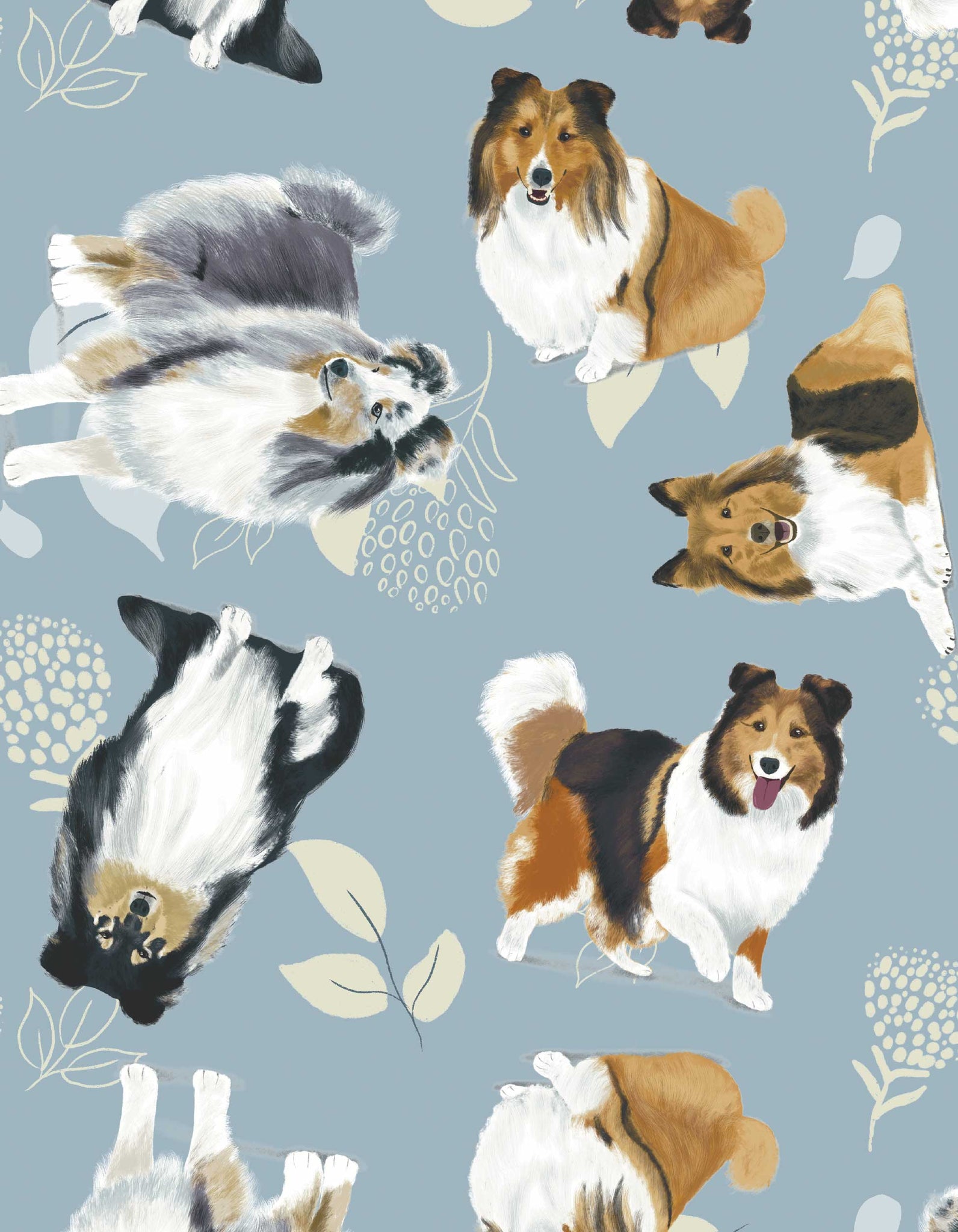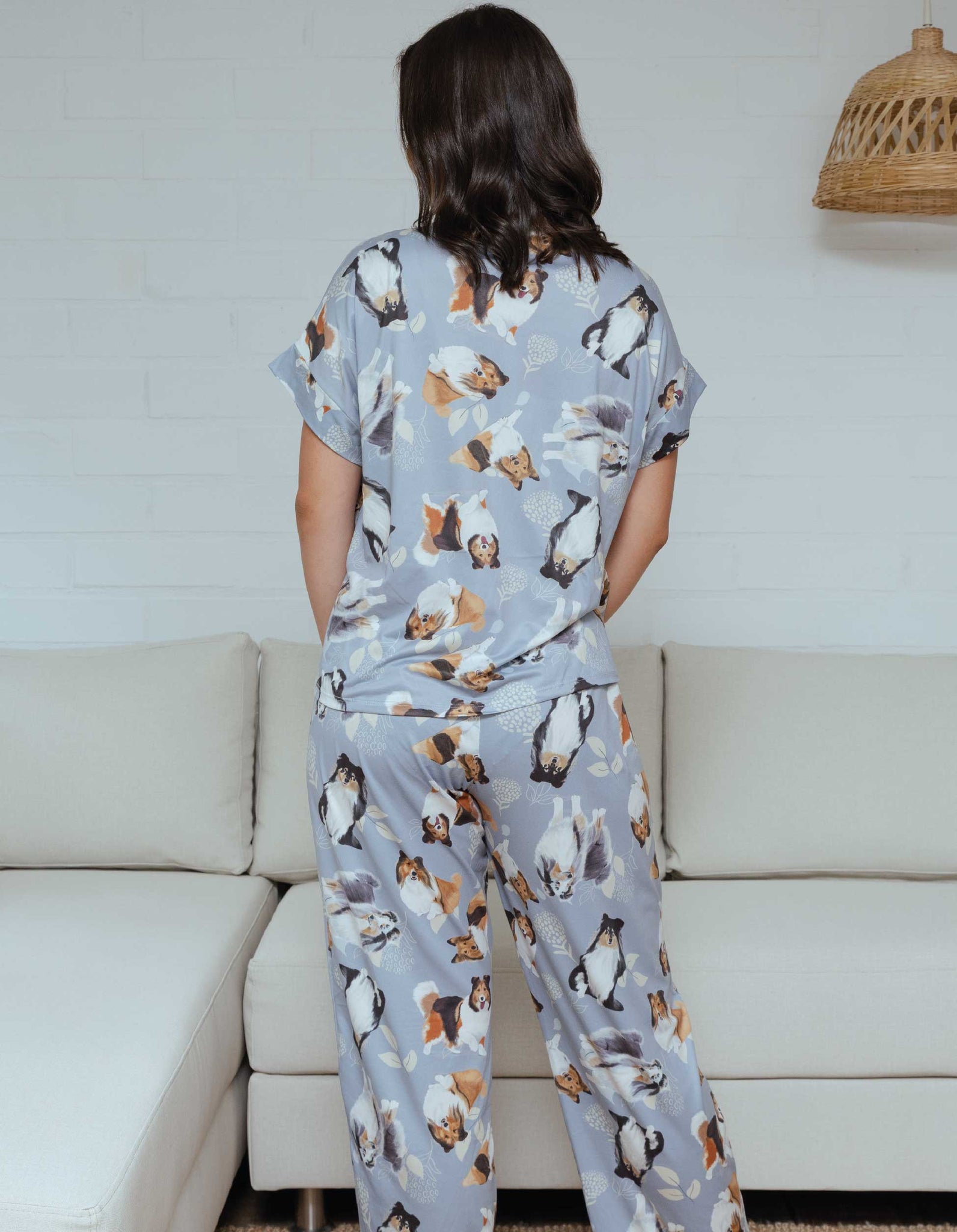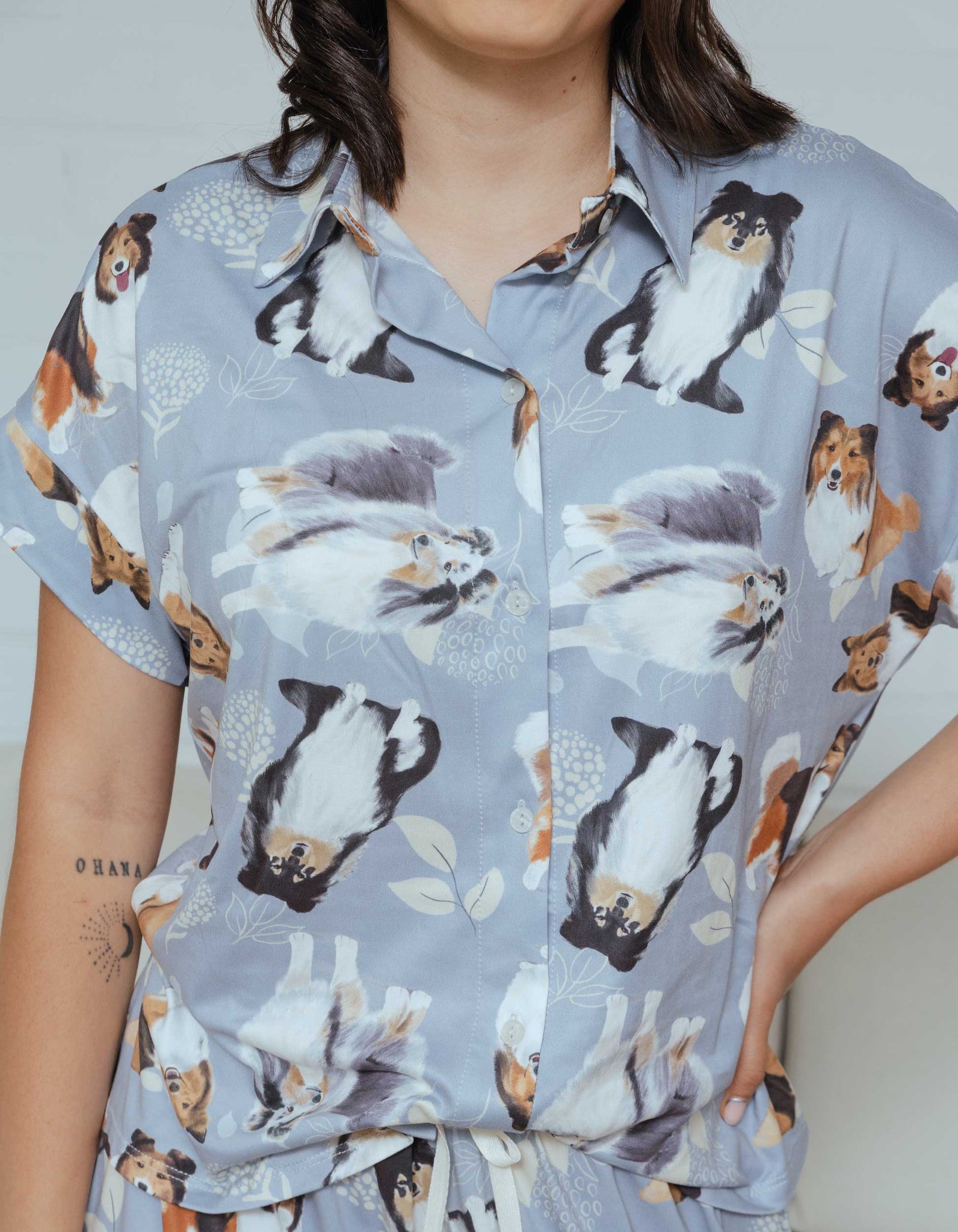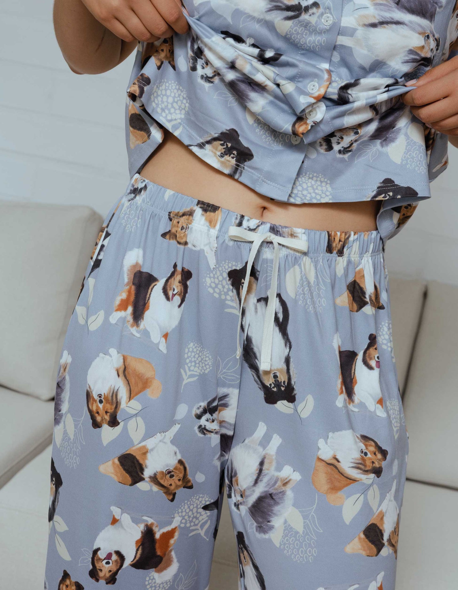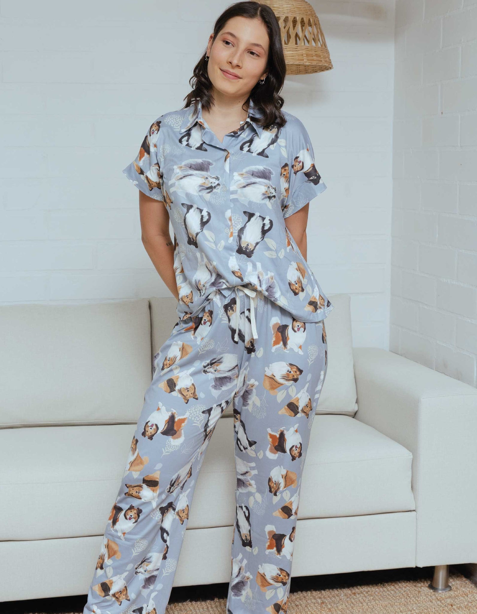 Pijama de pantalón largo y camisa de botones manga corta, con un estampado adorable de ilustraciones de perritos Pastor Shetland hechas a mano.