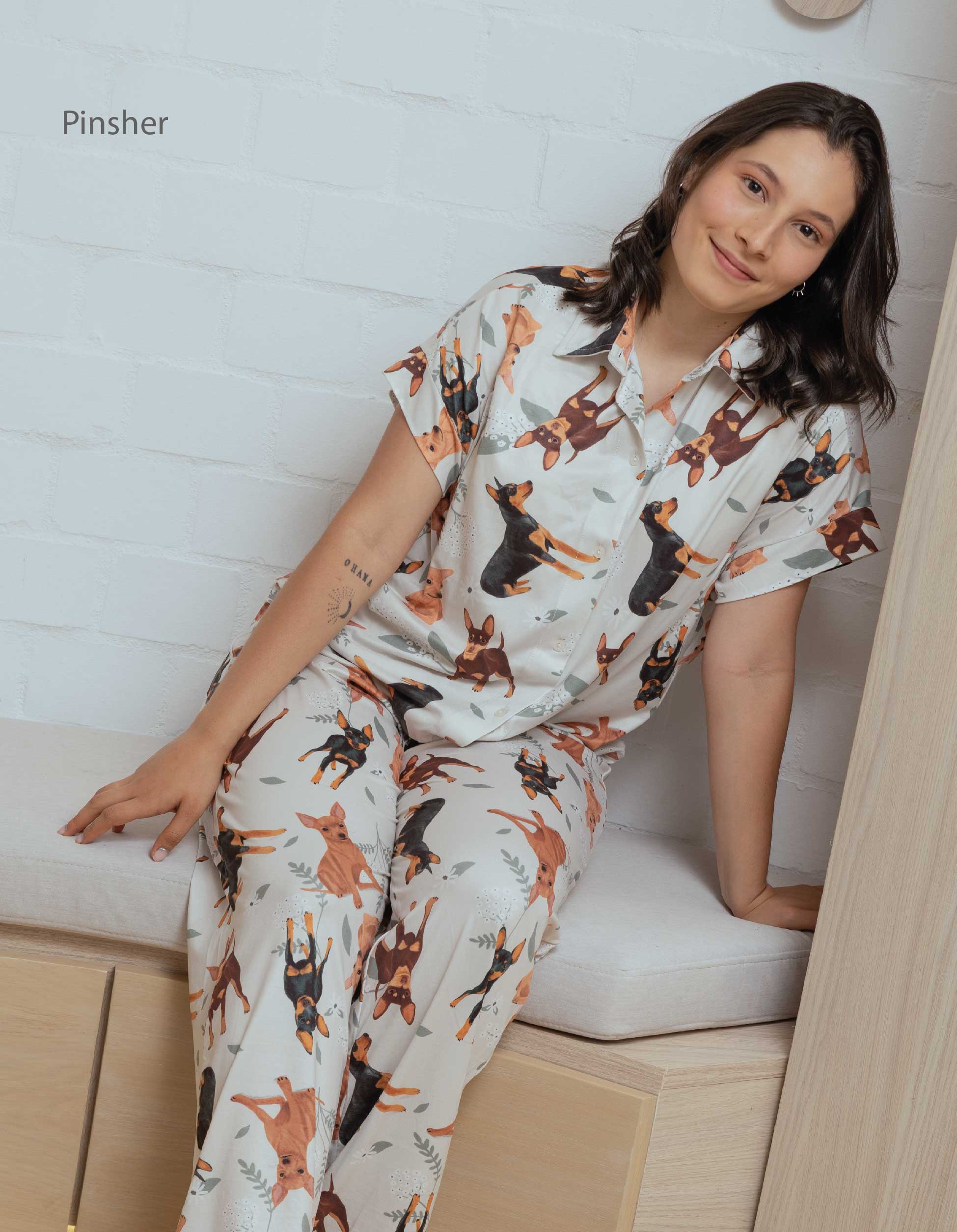 Pijama de pantalón largo y camisa de botones manga corta, con un estampado adorable de ilustraciones de perritos Pinsher hechas a mano.