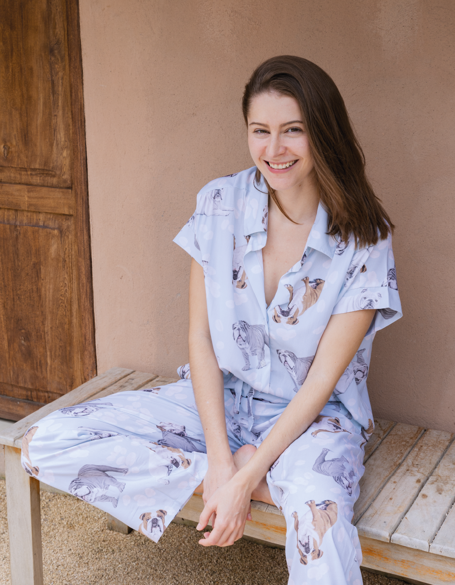 Ambas prendas estampadas con ilustraciones realizadas a mano de perros Bulldog Inglés. Es una pijama en viscosa (fibra natural), suave con la piel, muy cómoda y fresca.