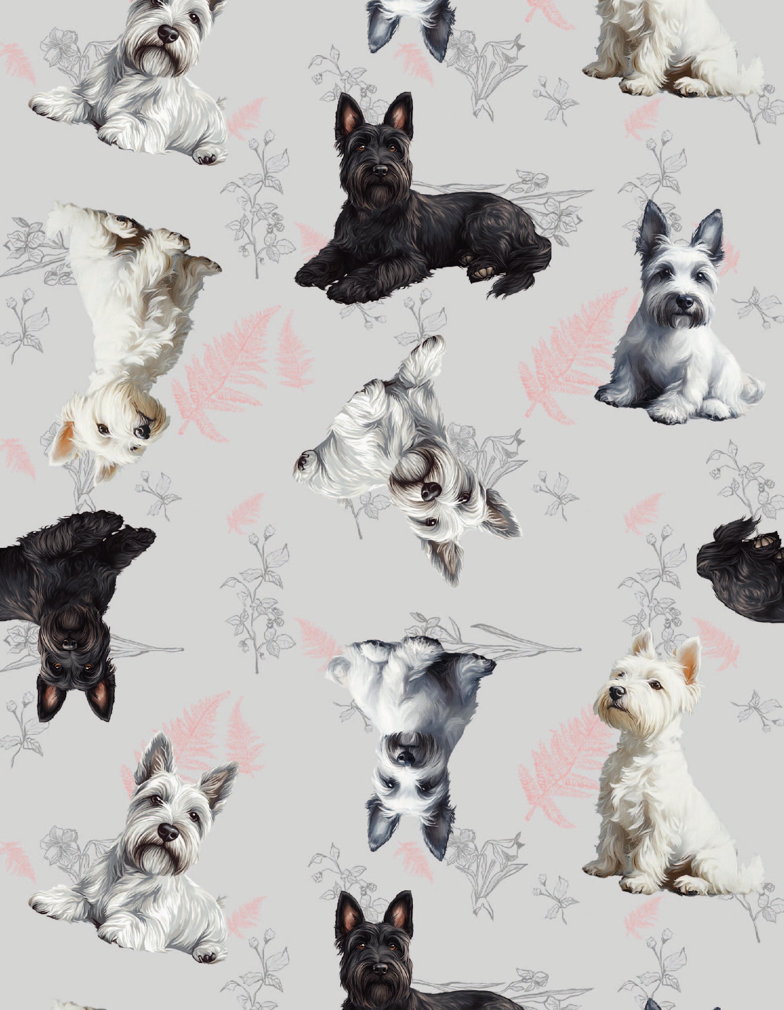 Ambas prendas están estampadas con ilustraciones realizadas a mano, de perros Scottish Terrier. La tela es piel de durazno, tiene tacto suave y buena elasticidad.