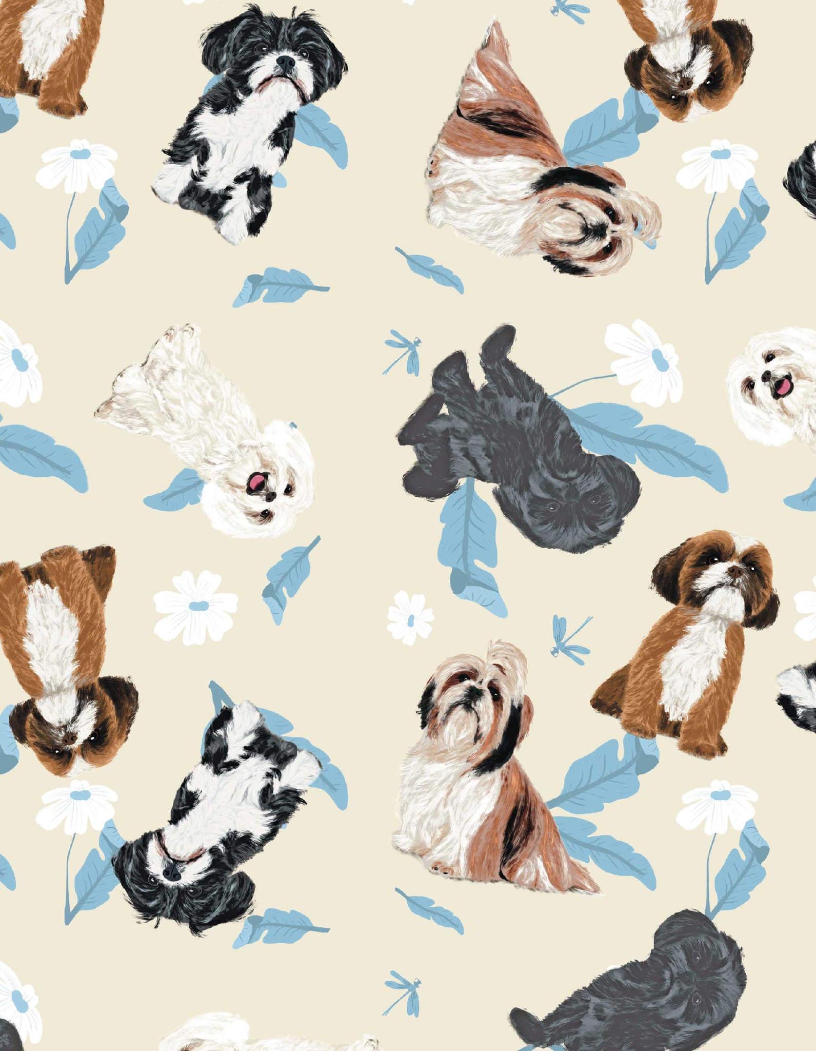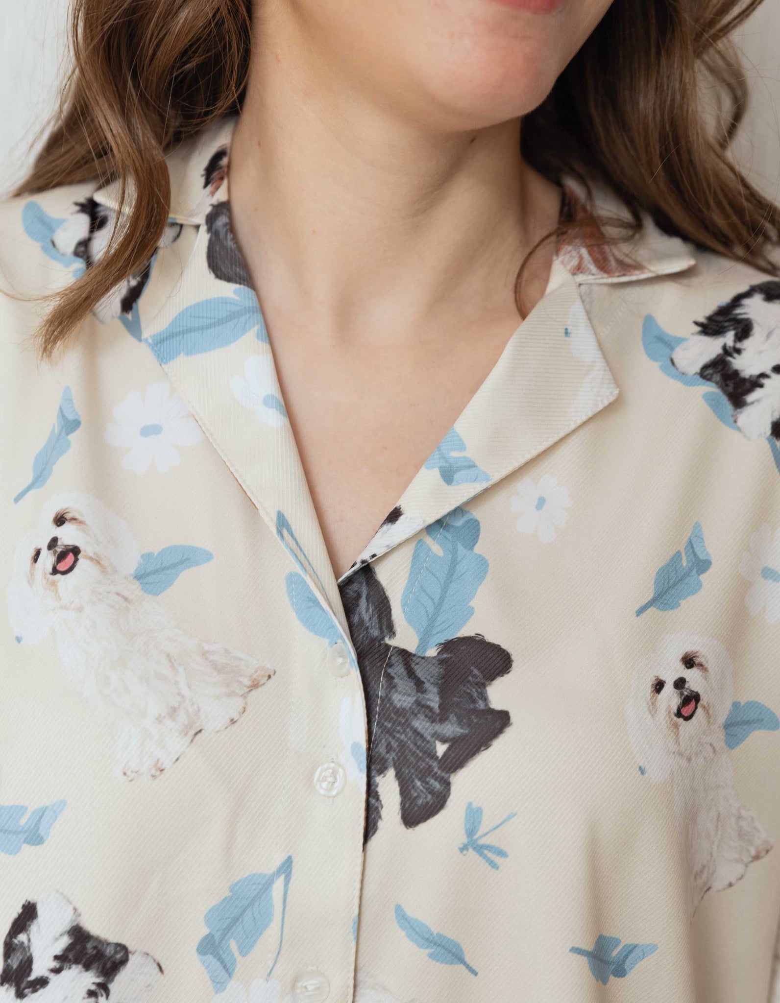 Ambas prendas están delicadamente adornadas con ilustraciones hechas a mano de adorables perros Shih Tzu.