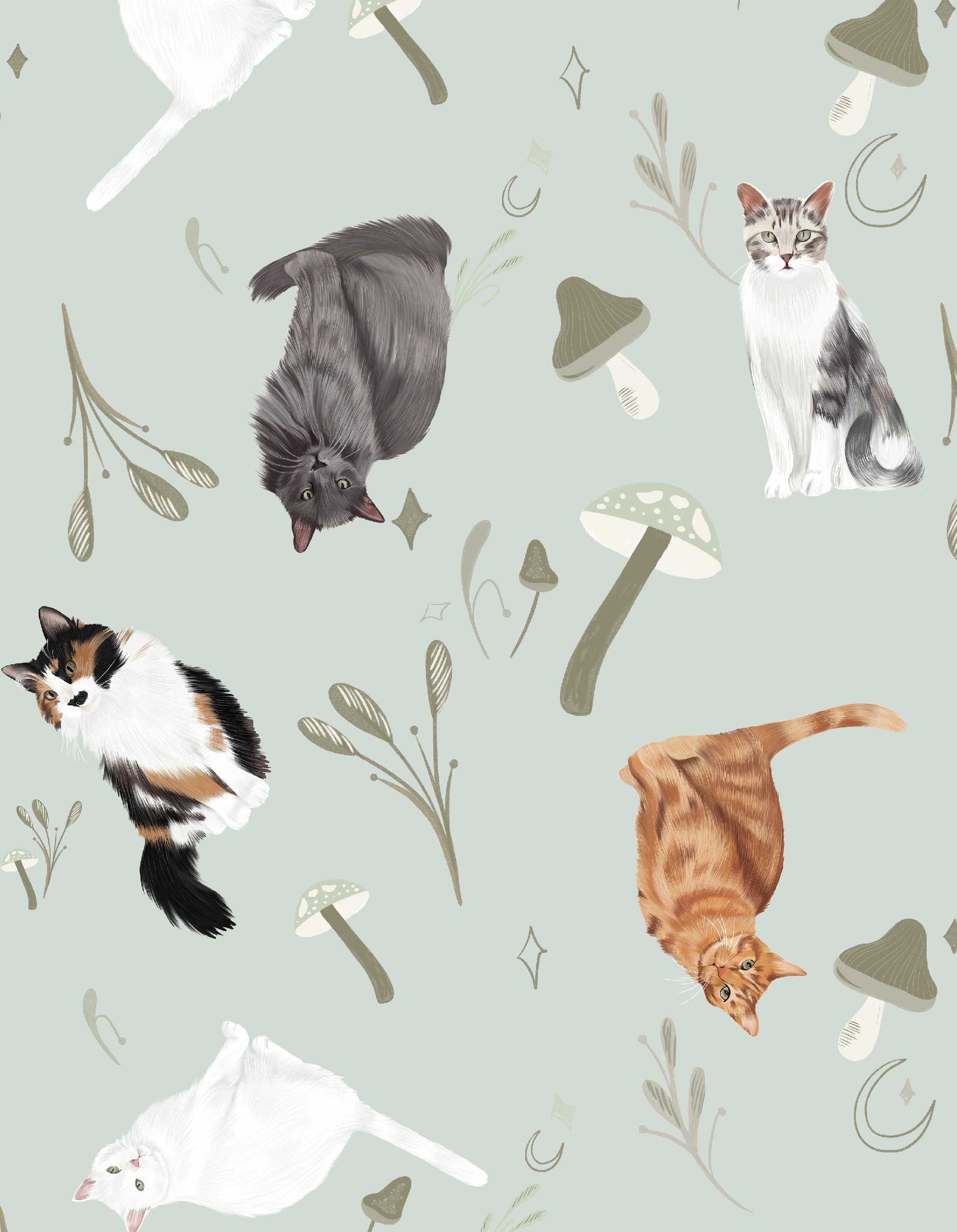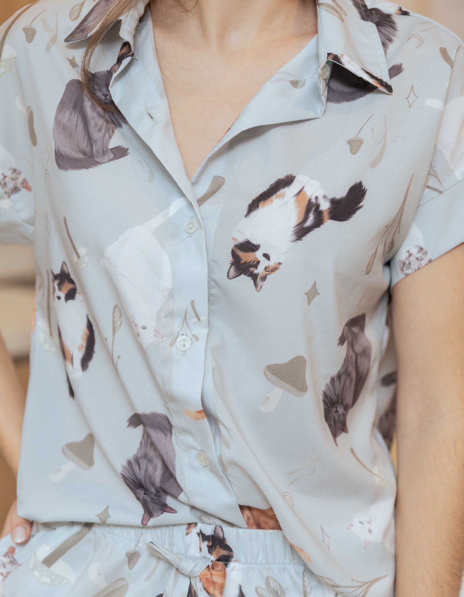 Ambas prendas estampadas con ilustraciones realizadas a mano, de gatos criollos.