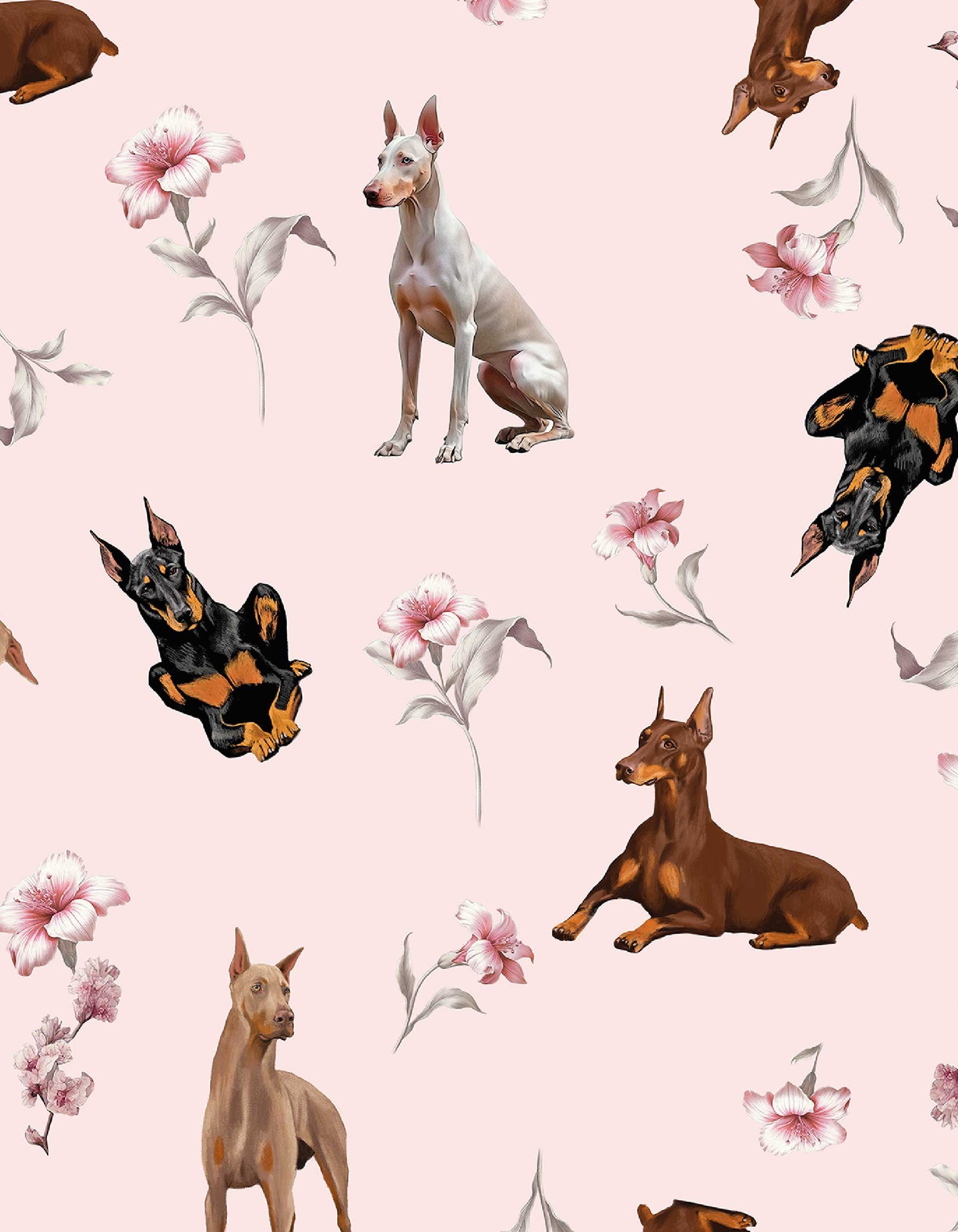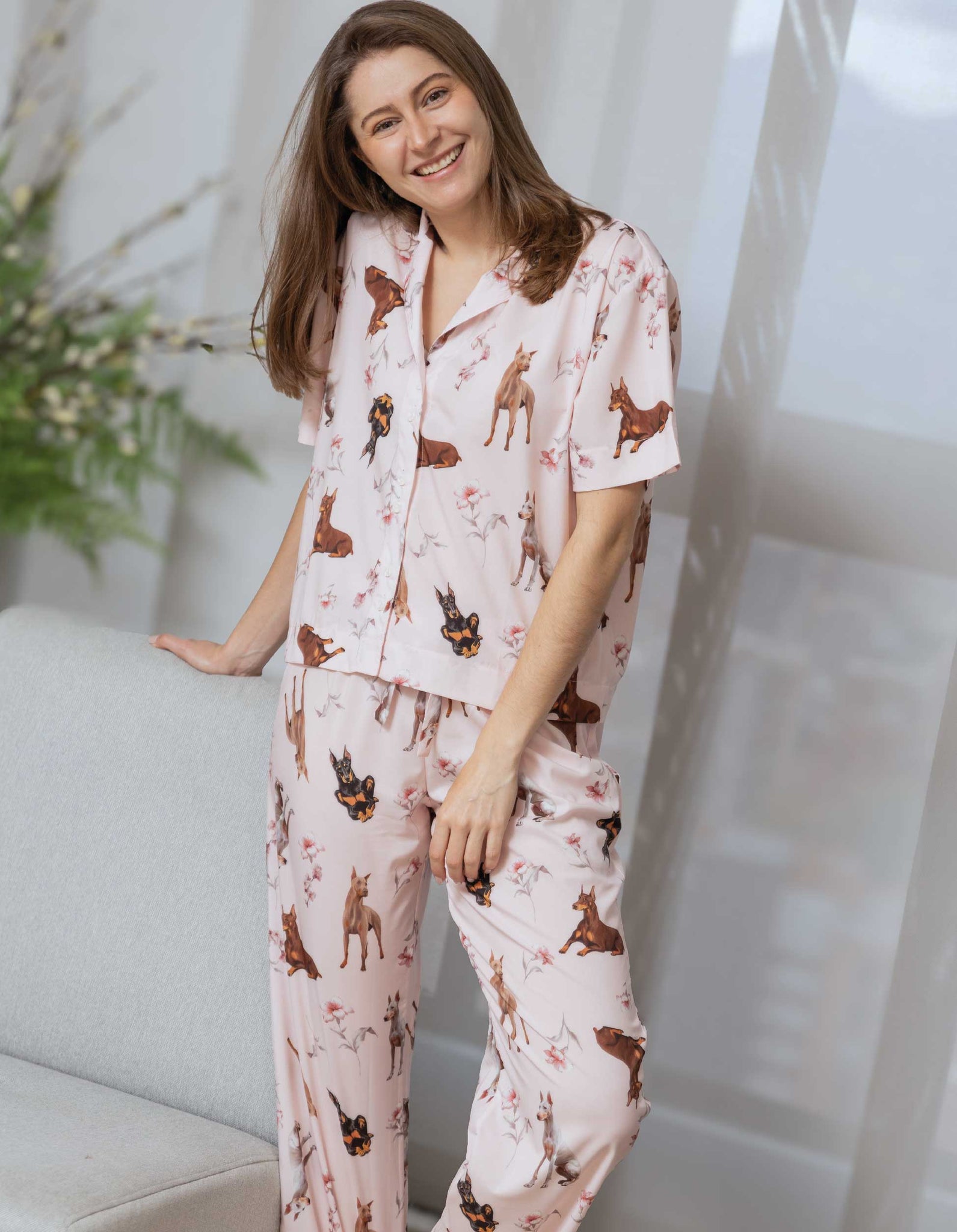 Ambas prendas estampadas con ilustraciones realizadas a mano de perros Dóberman. Es una pijama de satín opaco, suave con la piel muy cómoda y elegante.