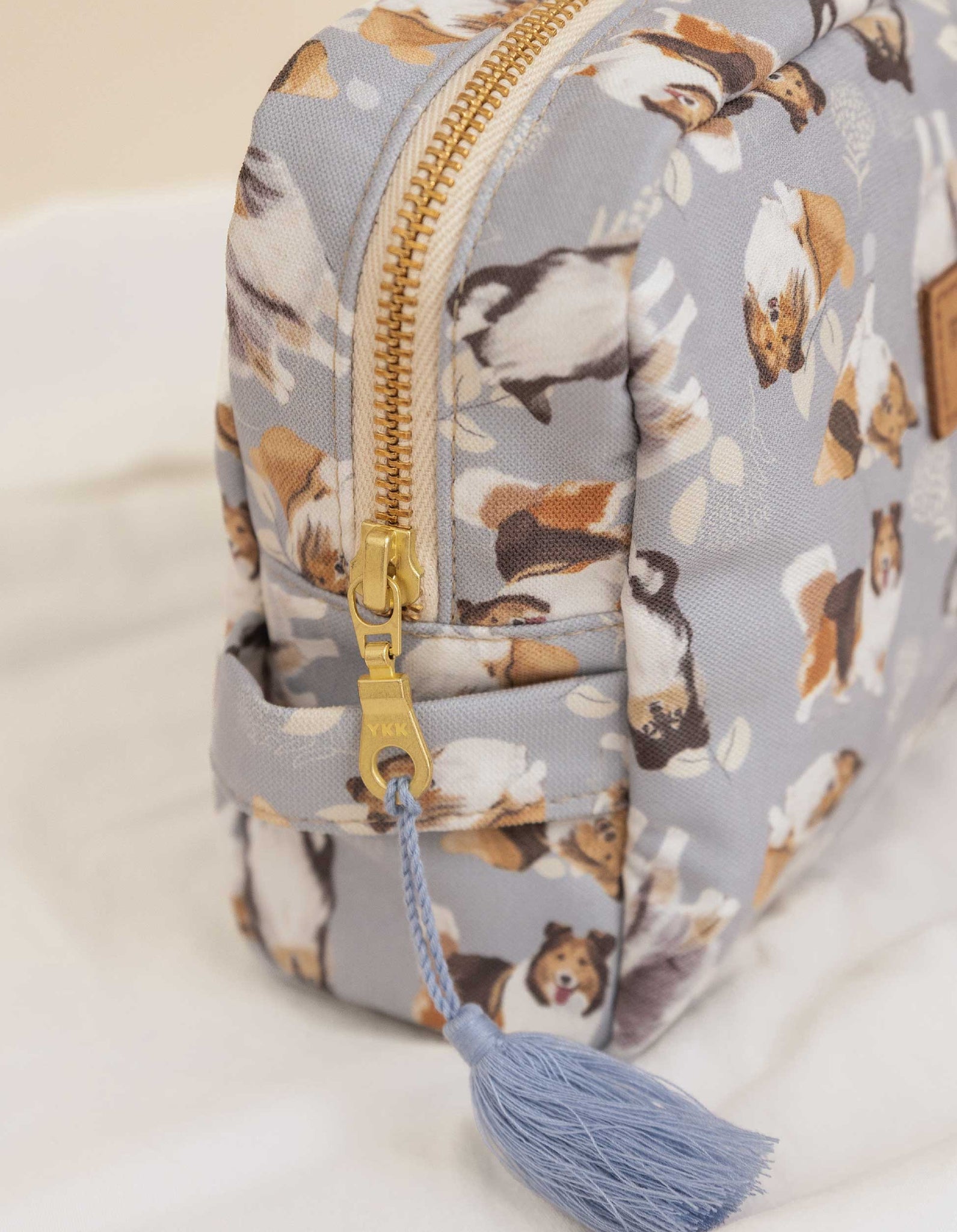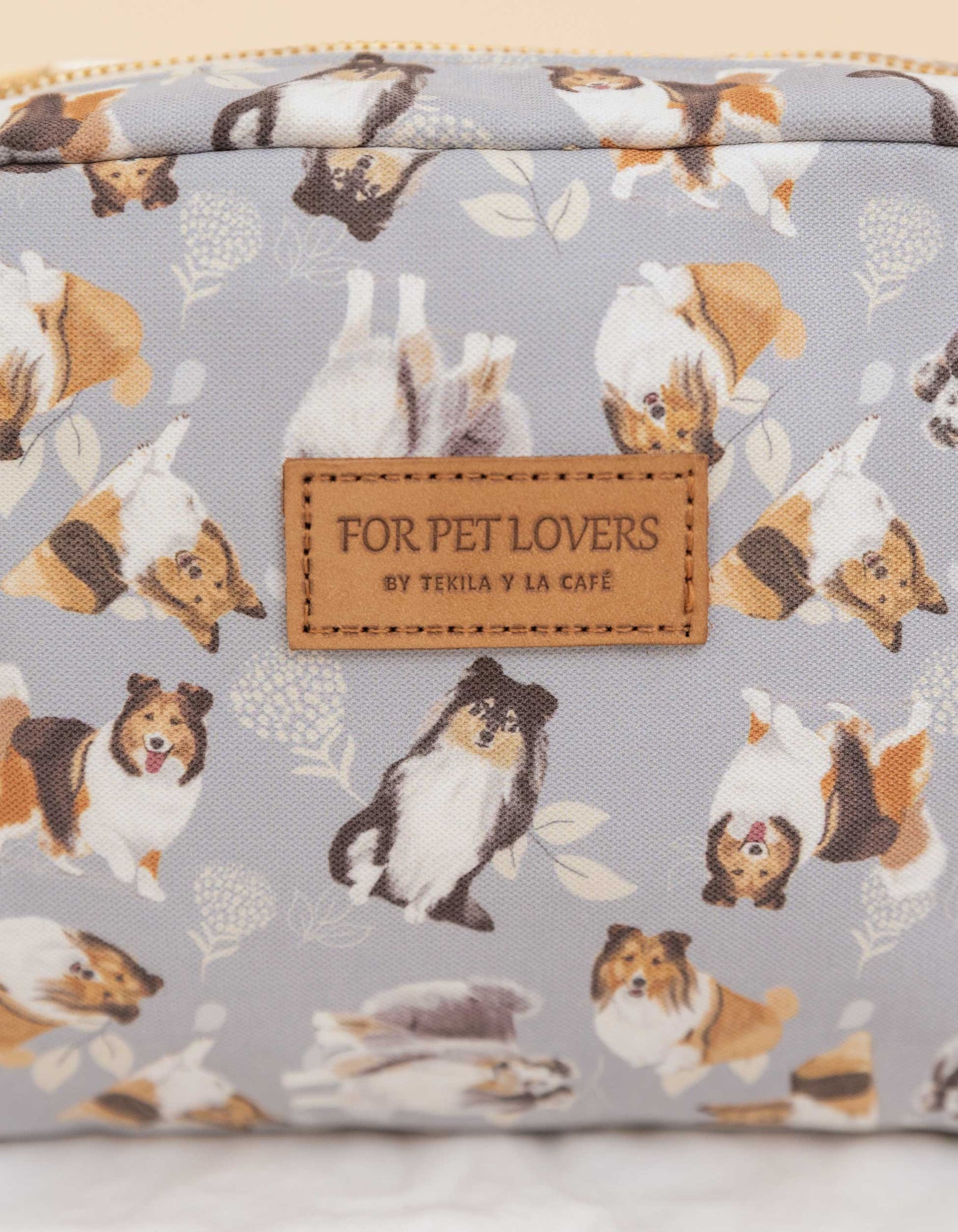 Cosmetiquera estampada, ideal para ti. Diseñada con el corazón, presenta ilustraciones de Pastor Shetland hechas a mano, ¡para que siempre lleves a tu peludito contigo!
