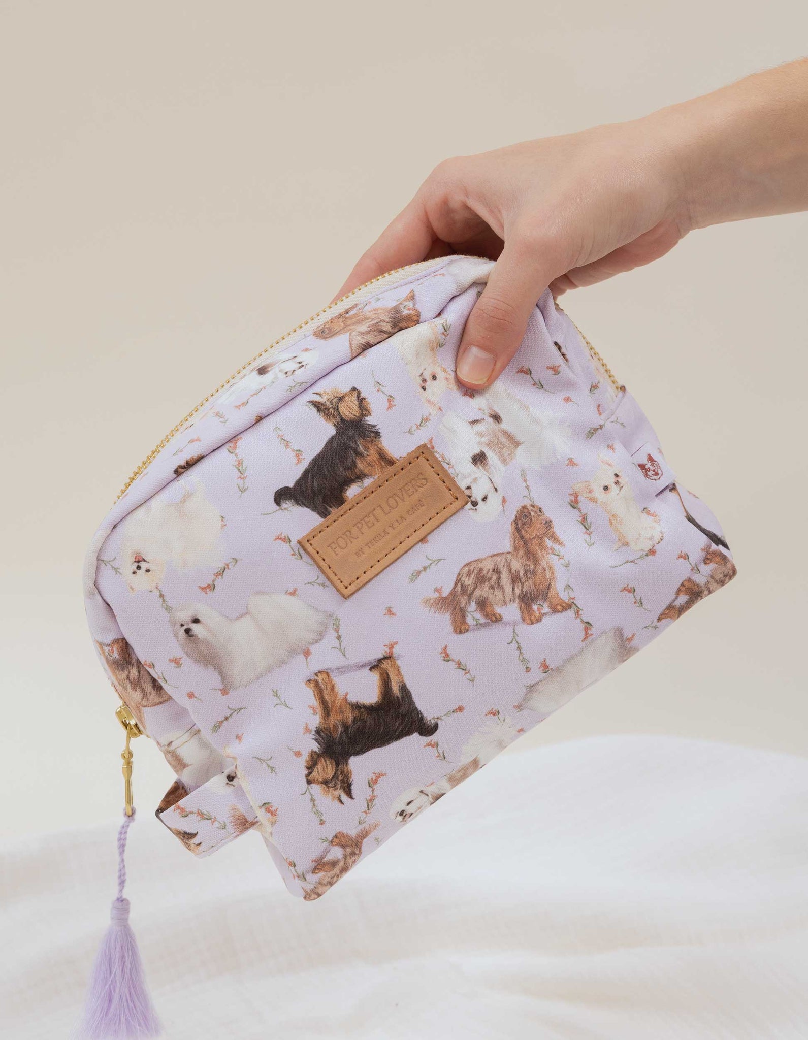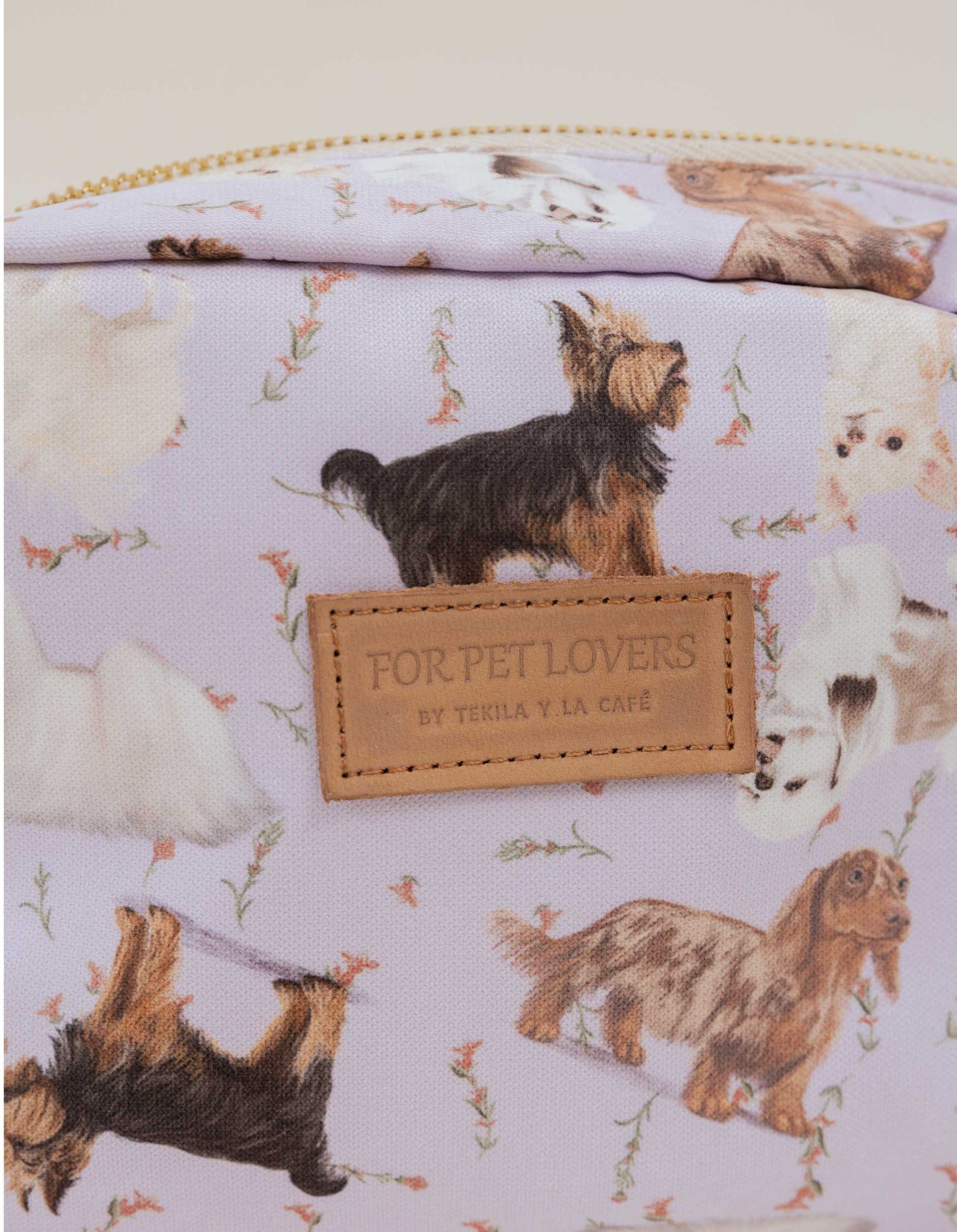 Cosmetiquera estampada, con forro interno en tela anti fluidos, cremallera dorada y borla decorativa. Detalle contramarcado en cuero 100%. Este producto está ilustrado a mano con diferentes razas como: Yorkie, Shih Tzu, Pomerania, Maltés, Salchicha, Chihuahua. ¡Busca tu peludito!