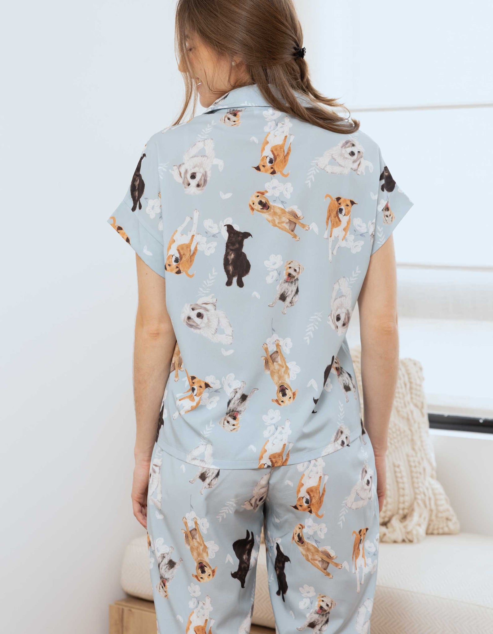 Ambas prendas estampadas con ilustraciones realizadas a mano de perros criollos. Es una pijama en tejido plano, suave con la piel muy cómoda y elegante.