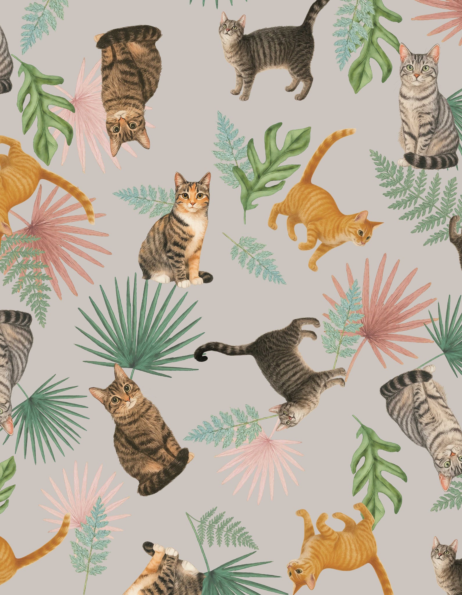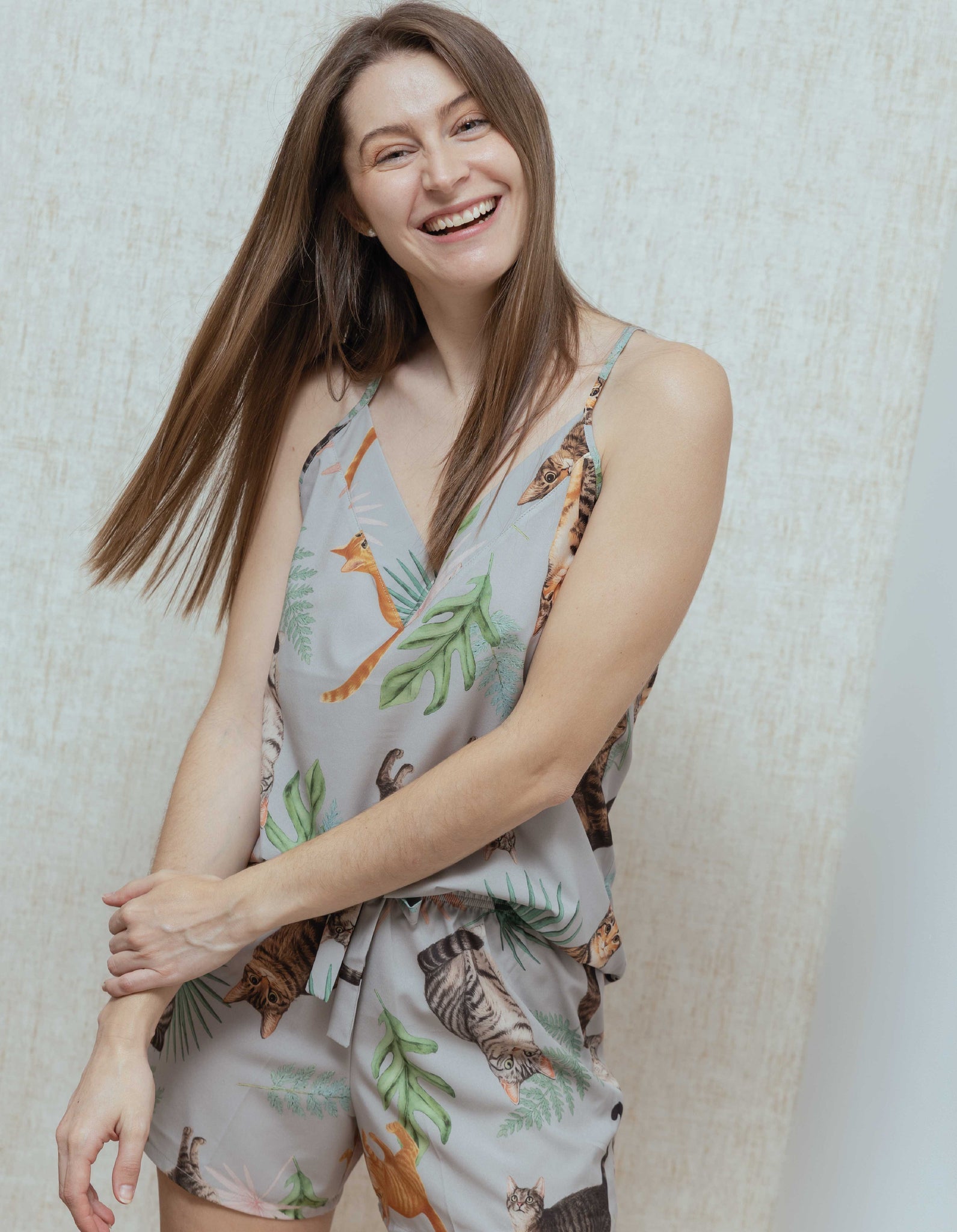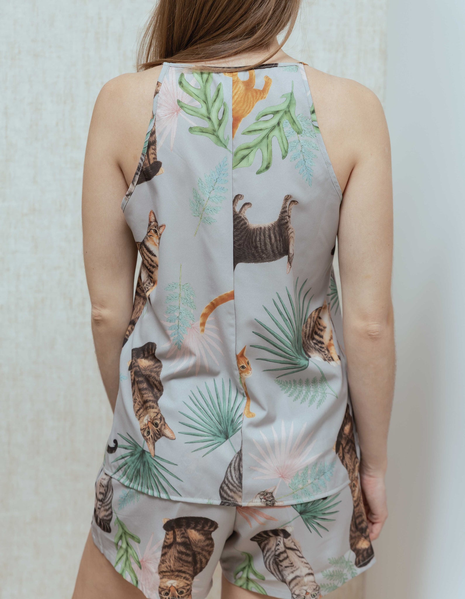 Ambas prendas estampadas con ilustraciones realizadas a mano, de gatos rayados.